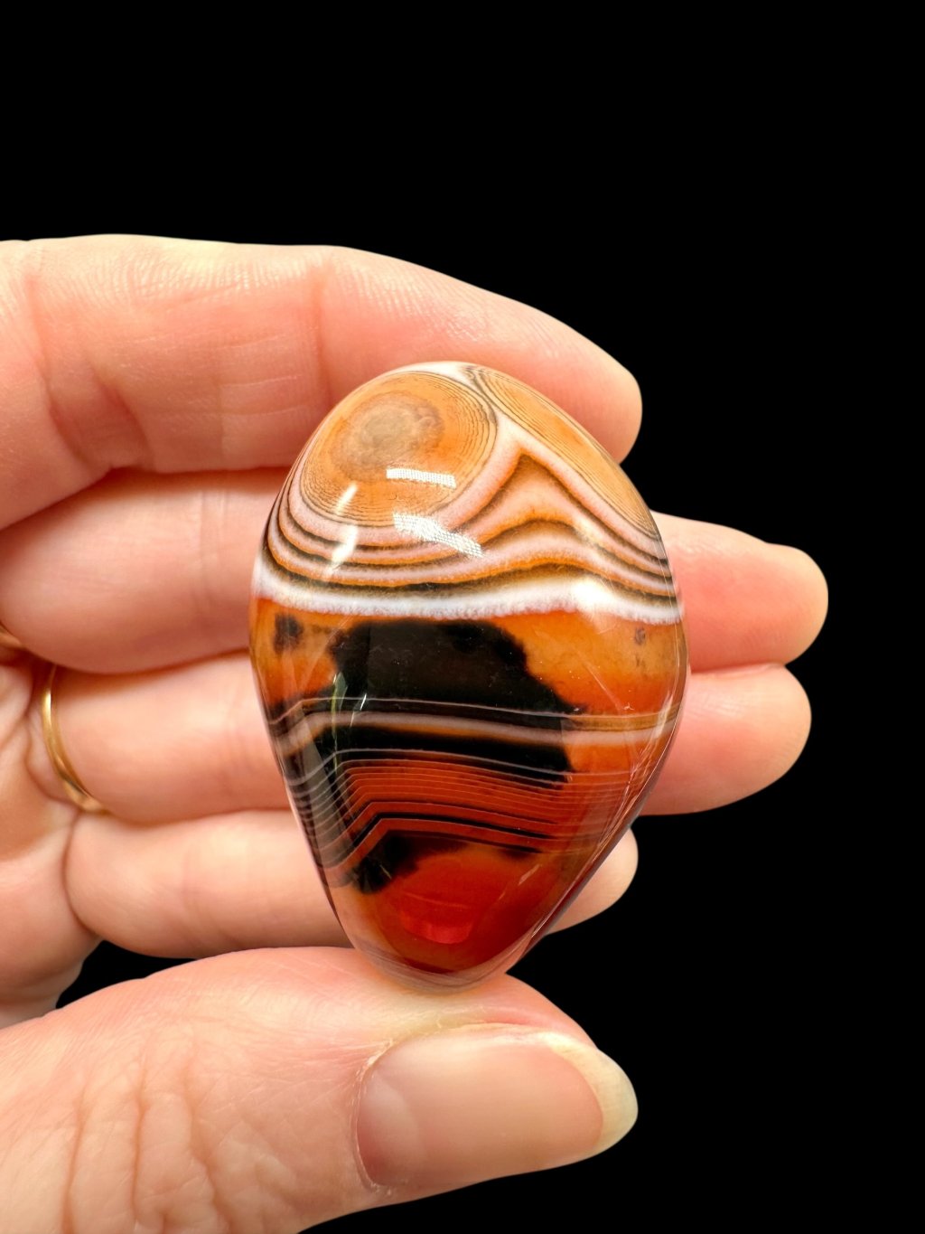 Einige Achate können erhitzt werden, um ihre natürliche Farbe zu verstärken. Beim Erhitzen wandeln sich weniger stabile Eisenformen in Hämatit um, was zu intensiveren roten und orangefarbenen Tönen führt. Dieser Prozess ist in der Gemmologie üblich und verändert die grundlegende mineralische Zusammensetzung des Steins nicht. Die resultierende Farbe ist dauerhaft und stabil.