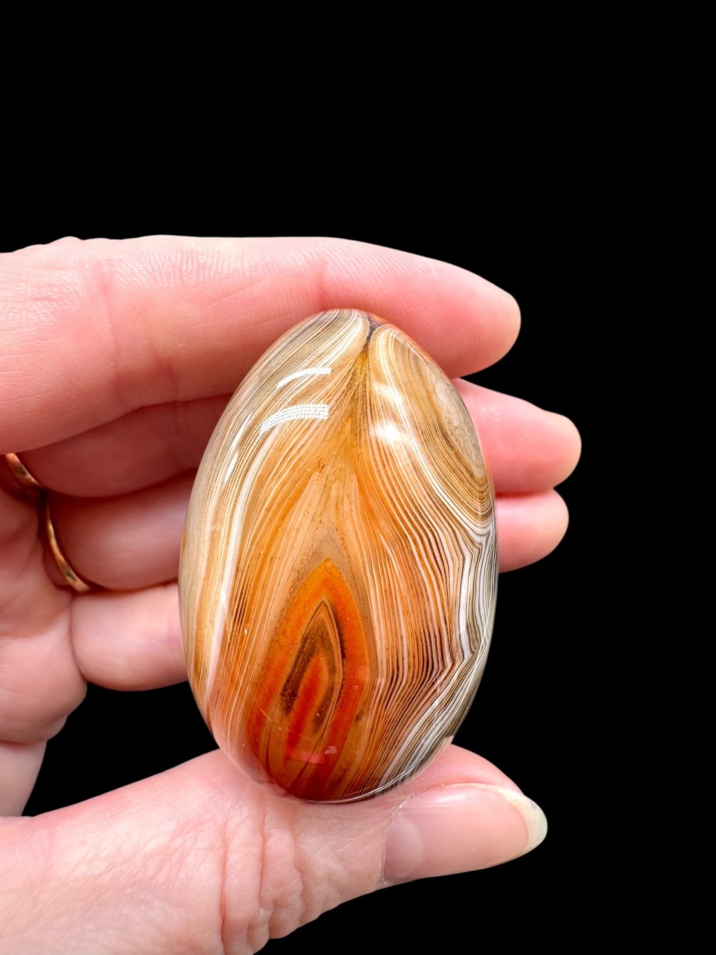 Einige Achate können erhitzt werden, um ihre natürliche Farbe zu verstärken. Beim Erhitzen wandeln sich weniger stabile Eisenformen in Hämatit um, was zu intensiveren roten und orangefarbenen Tönen führt. Dieser Prozess ist in der Gemmologie üblich und verändert die grundlegende mineralische Zusammensetzung des Steins nicht. Die resultierende Farbe ist dauerhaft und stabil.