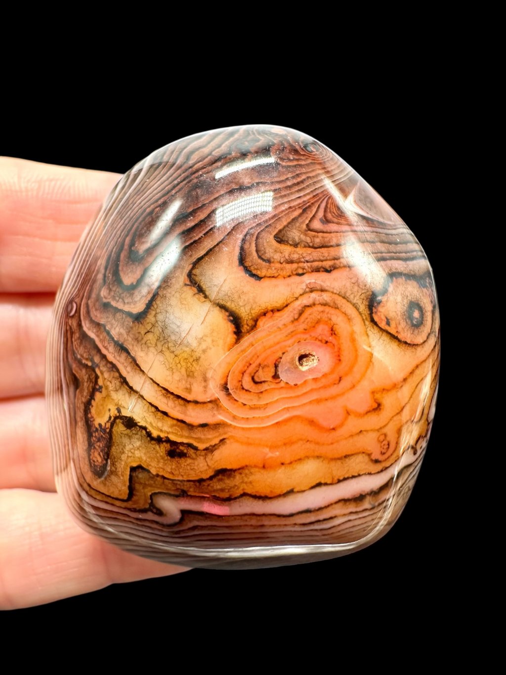 Einige Achate können erhitzt werden, um ihre natürliche Farbe zu verstärken. Beim Erhitzen wandeln sich weniger stabile Eisenformen in Hämatit um, was zu intensiveren roten und orangefarbenen Tönen führt. Dieser Prozess ist in der Gemmologie üblich und verändert die grundlegende mineralische Zusammensetzung des Steins nicht. Die resultierende Farbe ist dauerhaft und stabil.