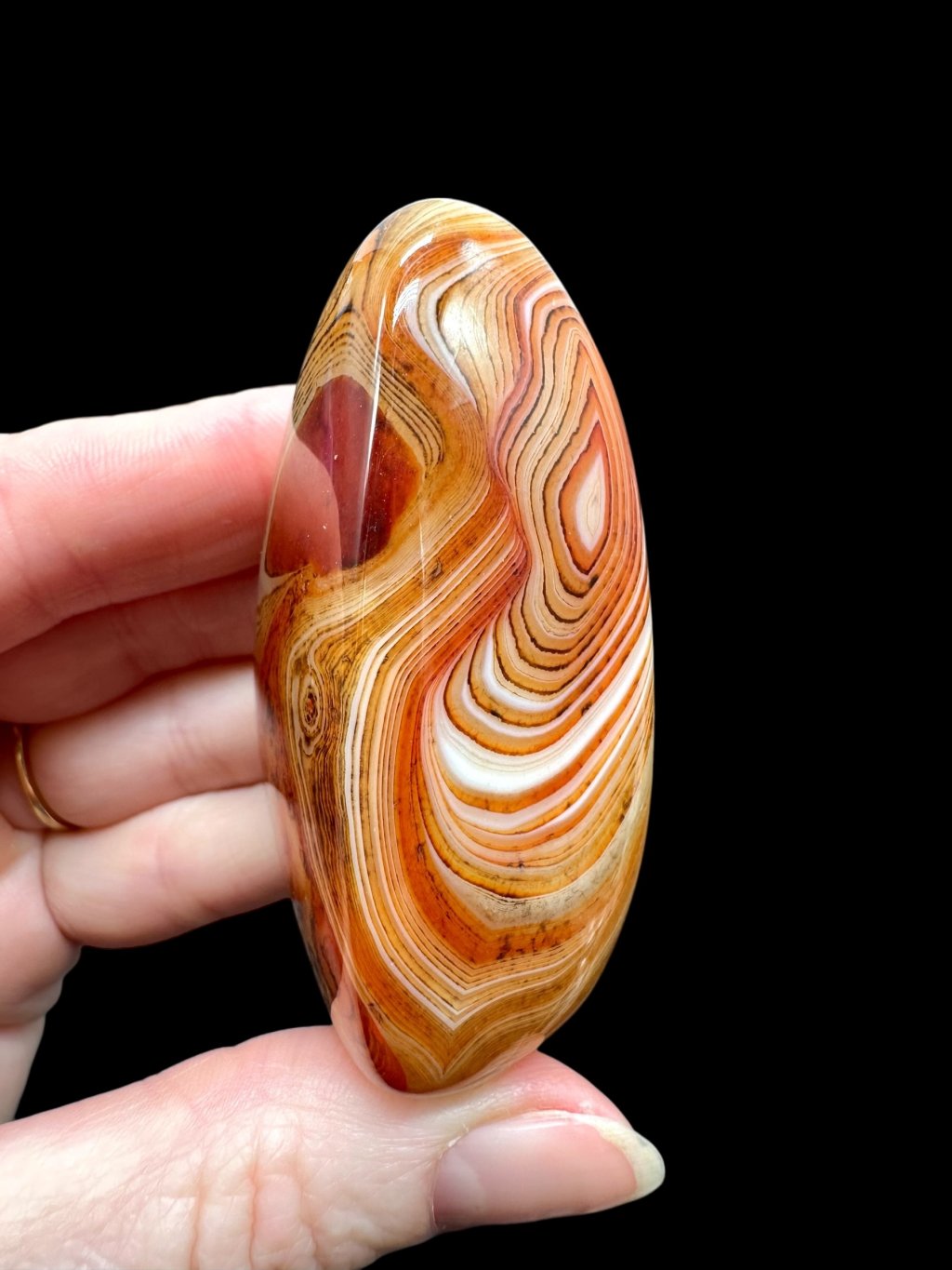 Einige Achate können erhitzt werden, um ihre natürliche Farbe zu verstärken. Beim Erhitzen wandeln sich weniger stabile Eisenformen in Hämatit um, was zu intensiveren roten und orangefarbenen Tönen führt. Dieser Prozess ist in der Gemmologie üblich und verändert die grundlegende mineralische Zusammensetzung des Steins nicht. Die resultierende Farbe ist dauerhaft und stabil.