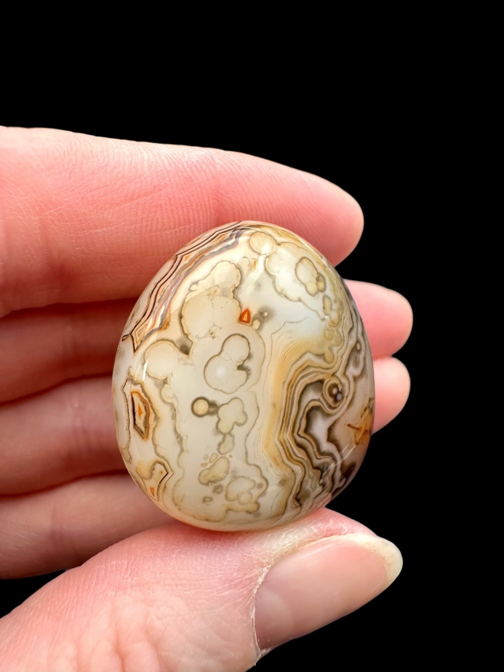 Die roten und orangefarbenen Farbtöne der Achate werden durch das Vorhandensein von Eisenoxiden verursacht, insbesondere durch die Minerale Hämatit und Goethit. Diese Minerale sind natürlicherweise im Achat enthalten und verleihen ihm seine charakteristische Farbe. Die Farbintensität hängt von der Eisenkonzentration und den Entstehungsbedingungen des Steins ab.