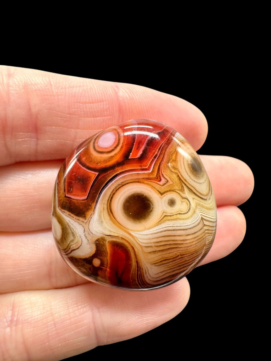 Einige Achate können erhitzt werden, um ihre natürliche Farbe zu verstärken. Beim Erhitzen wandeln sich weniger stabile Eisenformen in Hämatit um, was zu intensiveren roten und orangefarbenen Tönen führt. Dieser Prozess ist in der Gemmologie üblich und verändert die grundlegende mineralische Zusammensetzung des Steins nicht. Die resultierende Farbe ist dauerhaft und stabil.