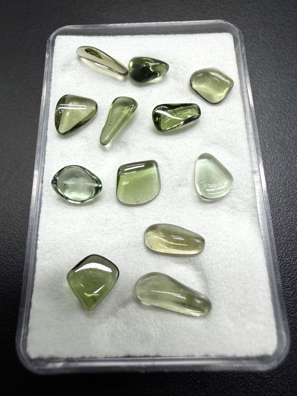 Getrommelter Moldavit in einer Schachtel, 0,5–1 ct – zufälliges Stück