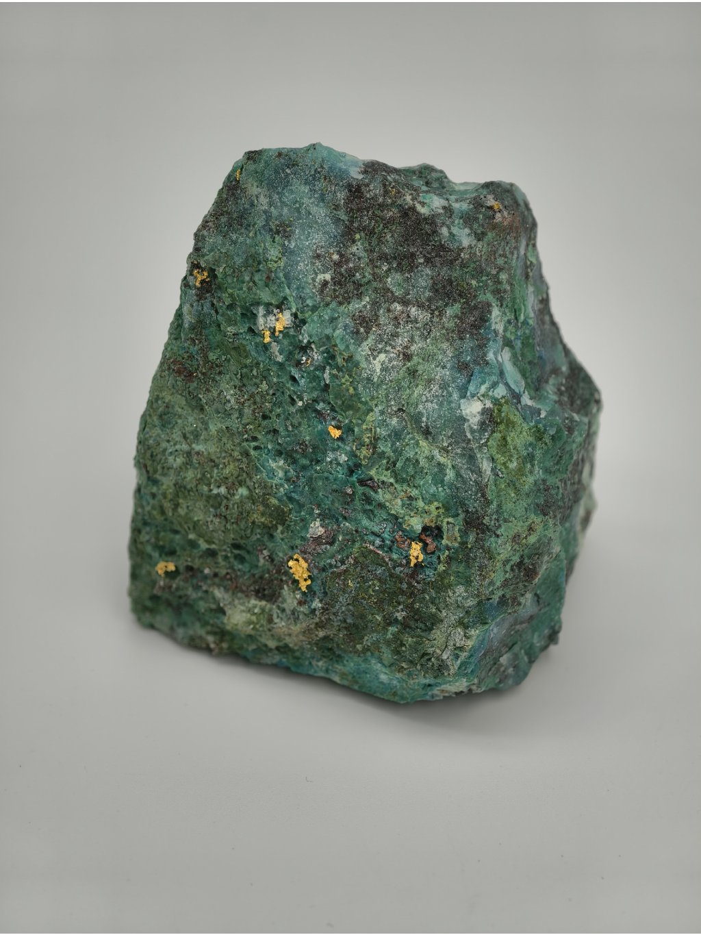 Dieses Stück ist ein kontrastreicher Fund von Gold auf einer kräftig grünen Matrix, die hauptsächlich aus Malachit besteht.