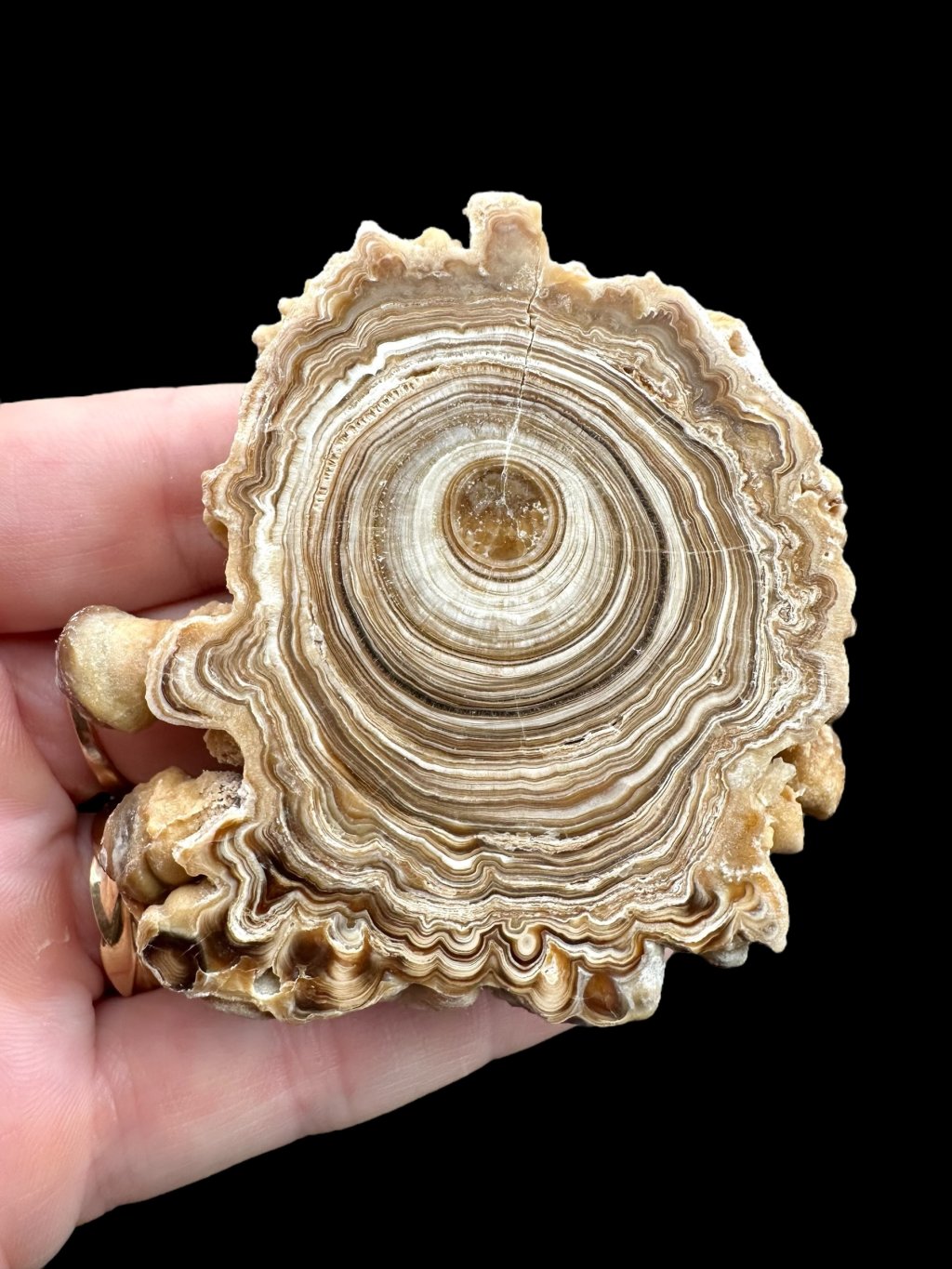 Dieses Produkt ist eine sorgfältig geschnittene und polierte Scheibe aus Tropfsteinkalzit.