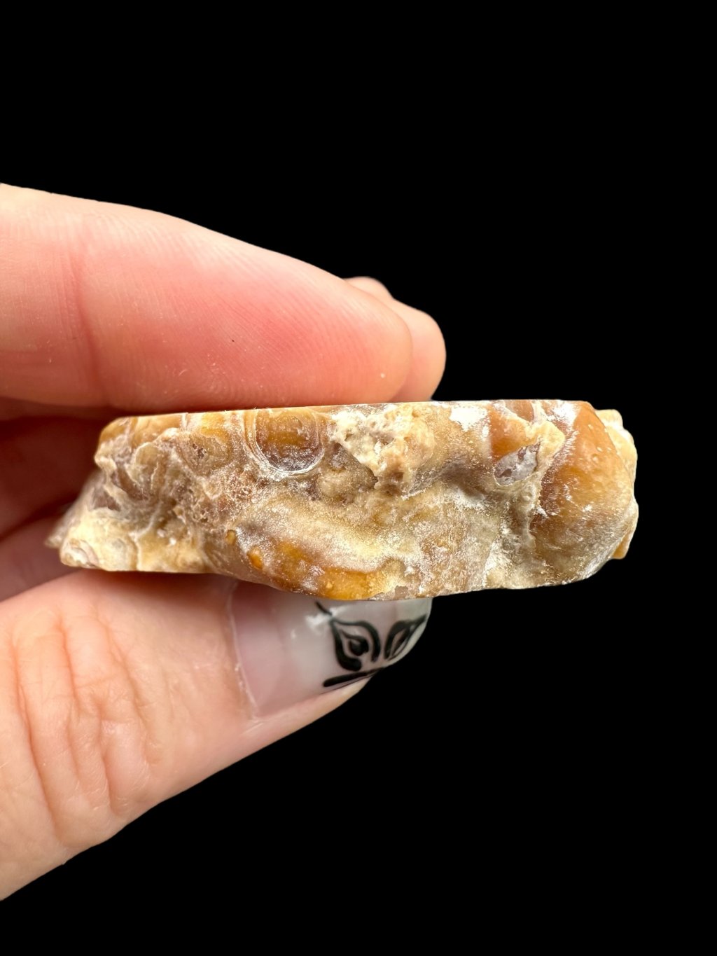 Die Farbe reicht von reinweiß über cremefarben bis zu honigfarben, manchmal mit einem Hauch von Orange oder Grau. Nach dem Polieren treten innere Strukturen, Zonierungen und glitzernde Flächen deutlich hervor.