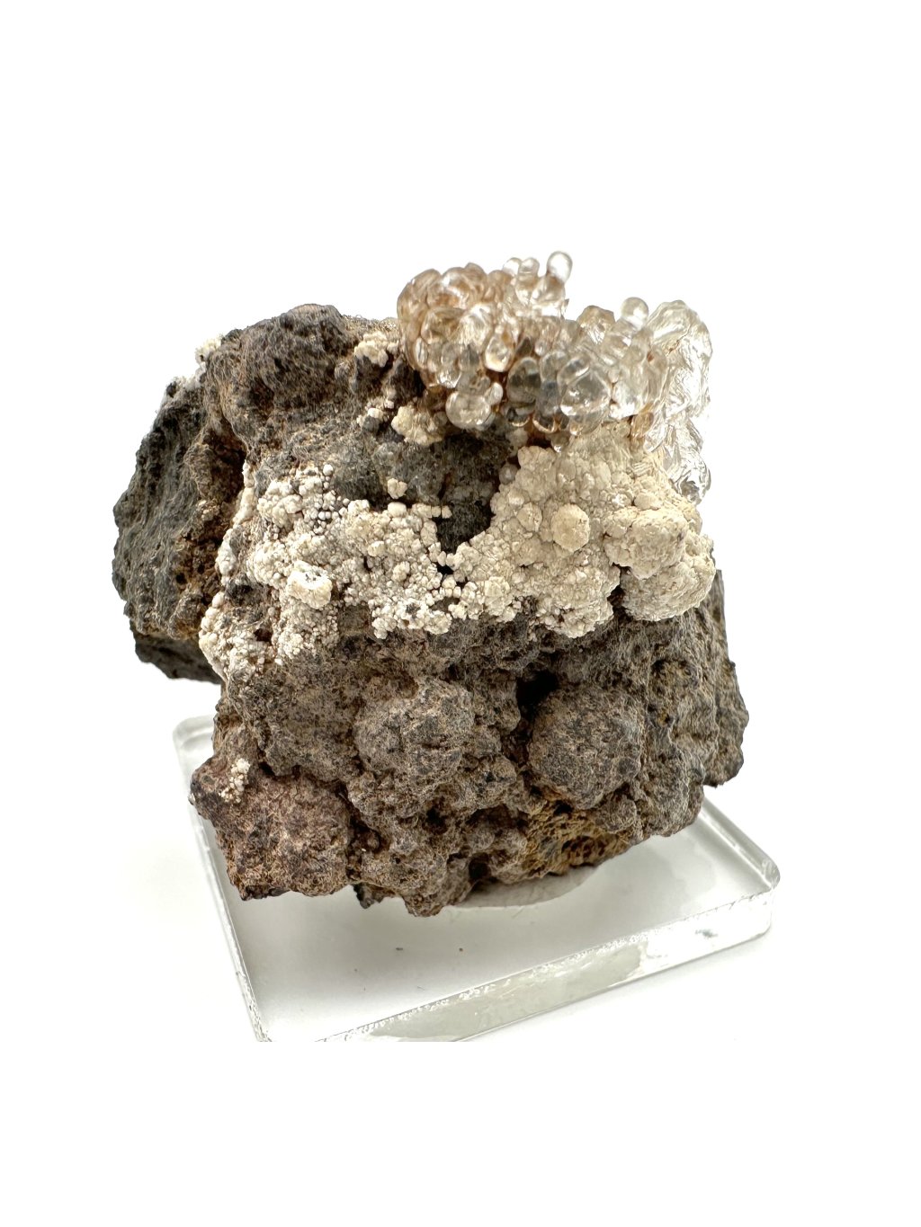 Hyalit, auch als Glasopal bekannt, ist eine Opalart, die sich durch ihre klare, farblose bis leicht gefärbte Struktur und ihren charakteristischen Glasglanz auszeichnet. Dieses Mineral besteht aus Kieselsäure (SiO₂) und enthält Wasser, was ihm seine einzigartigen Eigenschaften verleiht. Hyalit entsteht durch hydrothermale Prozesse nahe der Erdoberfläche, häufig in den Hohlräumen von Eruptivgestein wie Basalt. In der Tschechischen Republik gibt es ein bedeutendes Hyalitvorkommen in der Nähe von Valec, wo es in Form von trauben- oder stalaktitartigen Aggregaten auftritt.
