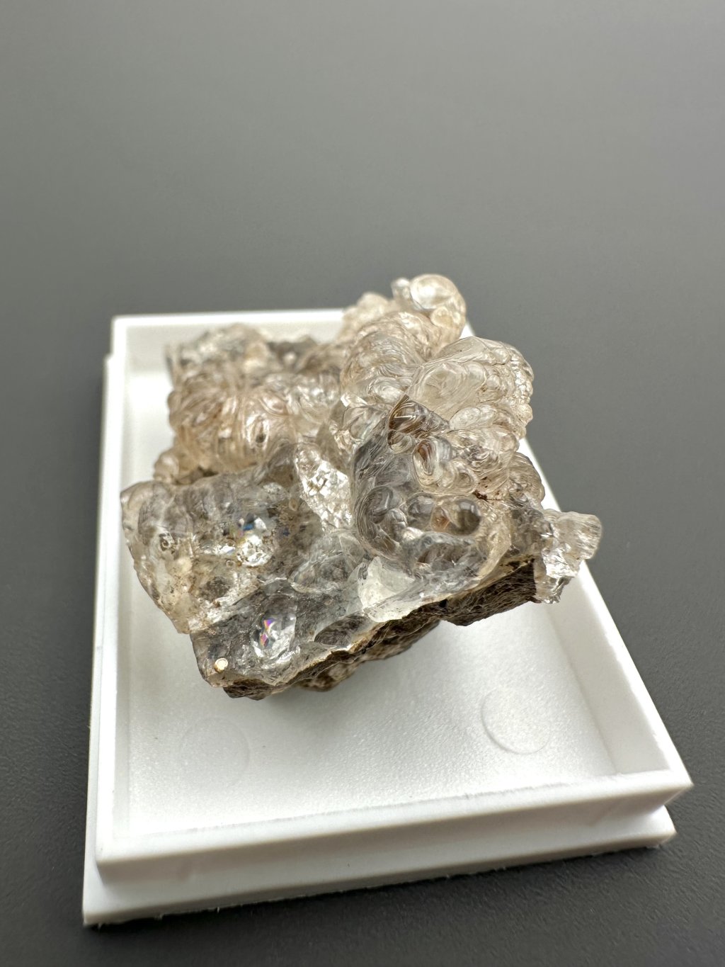 Hyalit, auch als Glasopal bekannt, ist eine Opalart, die sich durch ihre klare, farblose bis leicht gefärbte Struktur und ihren charakteristischen Glasglanz auszeichnet. Dieses Mineral besteht aus Kieselsäure (SiO₂) und enthält Wasser, was ihm seine einzigartigen Eigenschaften verleiht. Hyalit entsteht durch hydrothermale Prozesse nahe der Erdoberfläche, häufig in den Hohlräumen von Eruptivgestein wie Basalt. In der Tschechischen Republik gibt es ein bedeutendes Hyalitvorkommen in der Nähe von Valec, wo es in Form von trauben- oder stalaktitartigen Aggregaten auftritt.