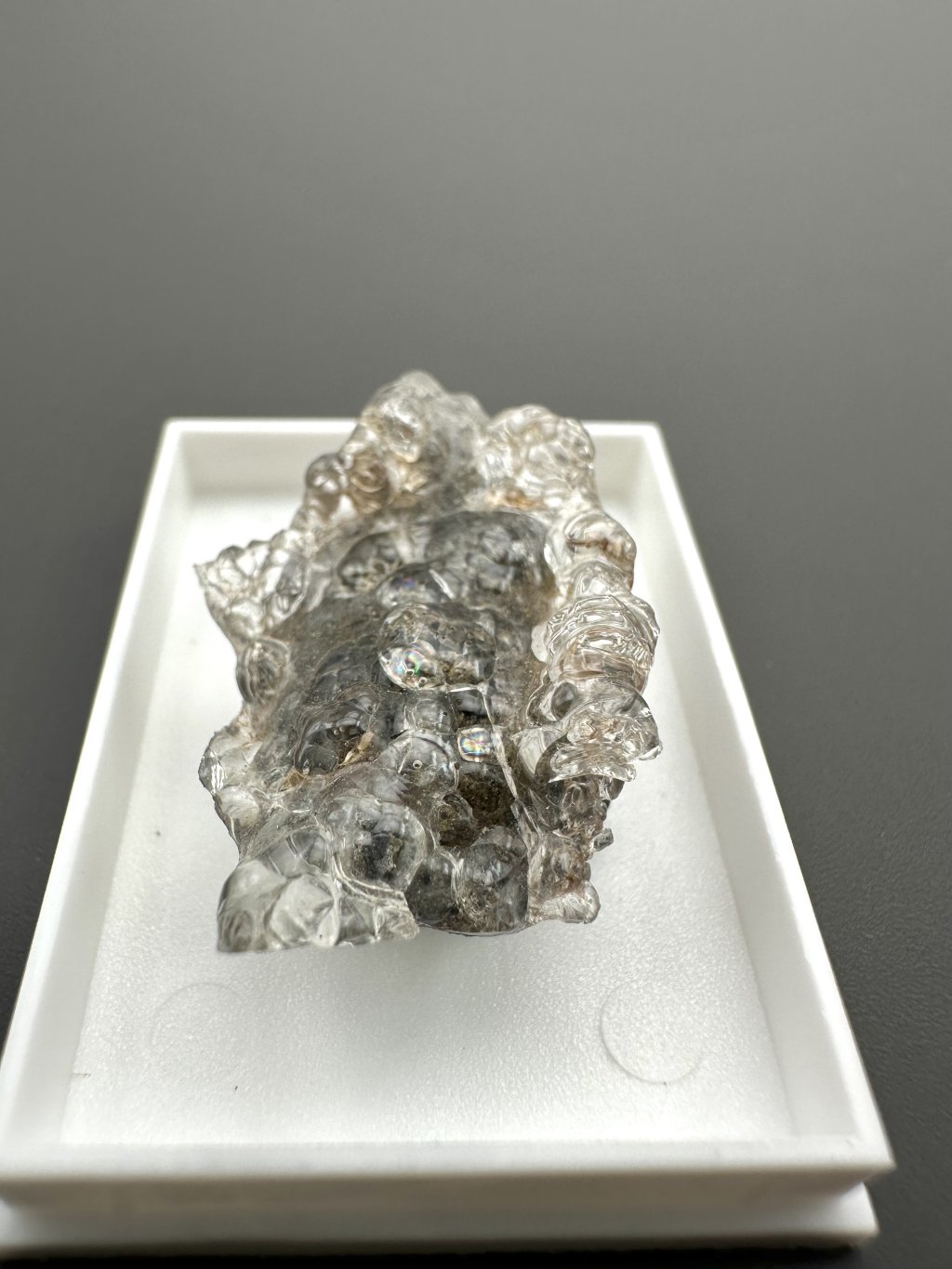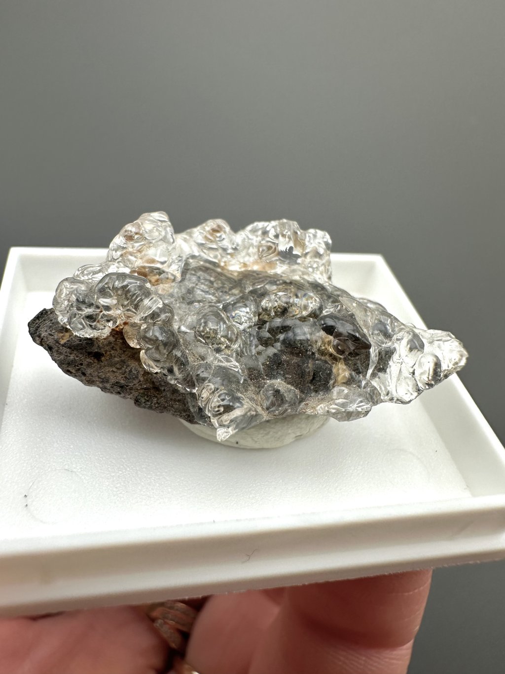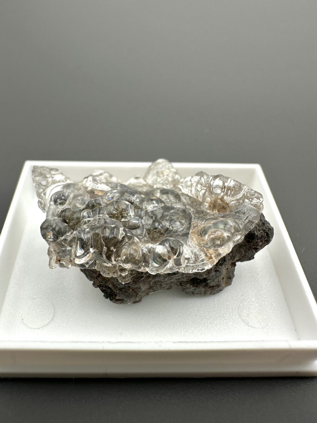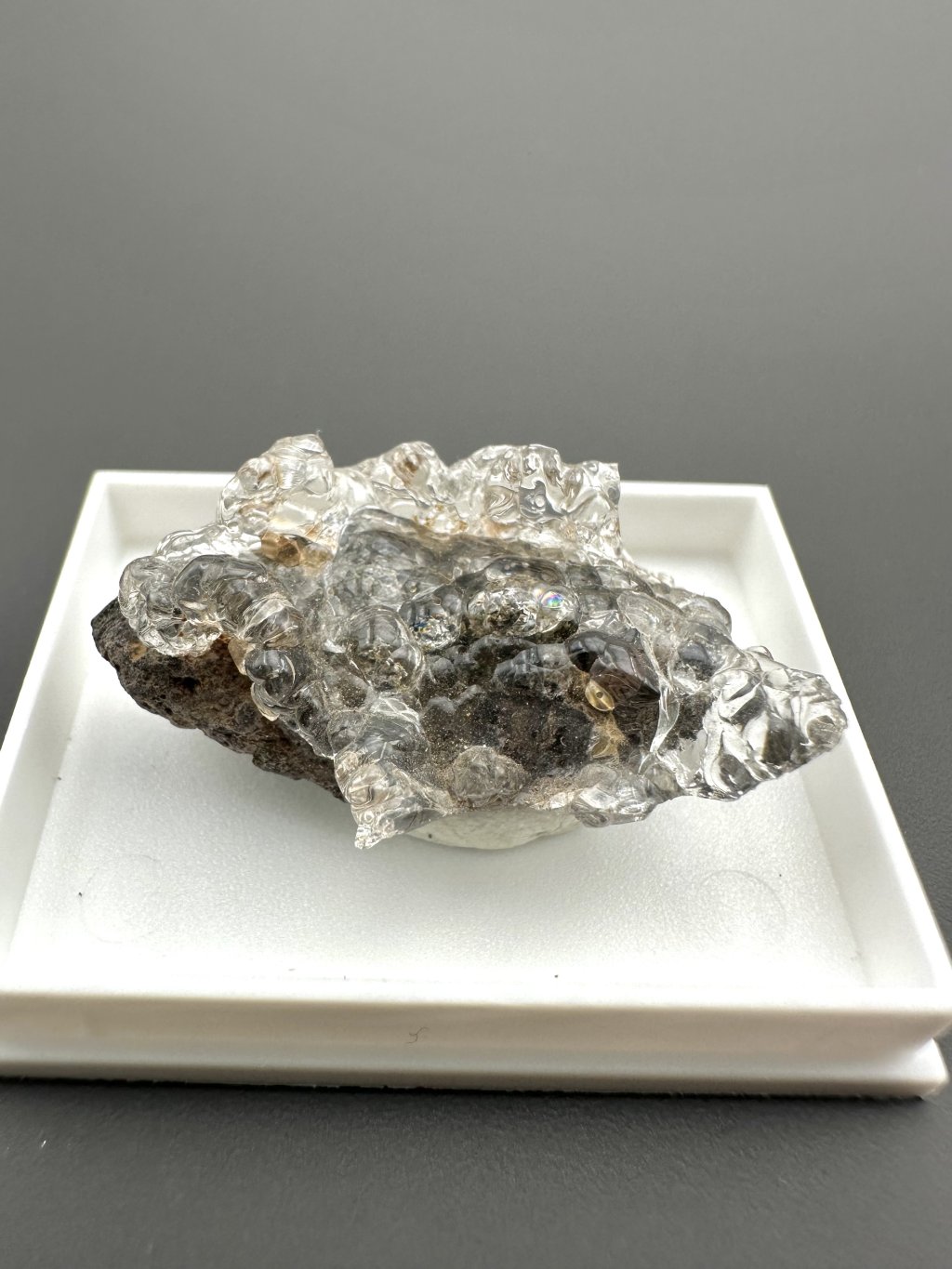 Hyalit, auch als Glasopal bekannt, ist eine Opalart, die sich durch ihre klare, farblose bis leicht gefärbte Struktur und ihren charakteristischen Glasglanz auszeichnet. Dieses Mineral besteht aus Kieselsäure (SiO₂) und enthält Wasser, was ihm seine einzigartigen Eigenschaften verleiht. Hyalit entsteht durch hydrothermale Prozesse nahe der Erdoberfläche, häufig in den Hohlräumen von Eruptivgestein wie Basalt. In der Tschechischen Republik gibt es ein bedeutendes Hyalitvorkommen in der Nähe von Valec, wo es in Form von trauben- oder stalaktitartigen Aggregaten auftritt.