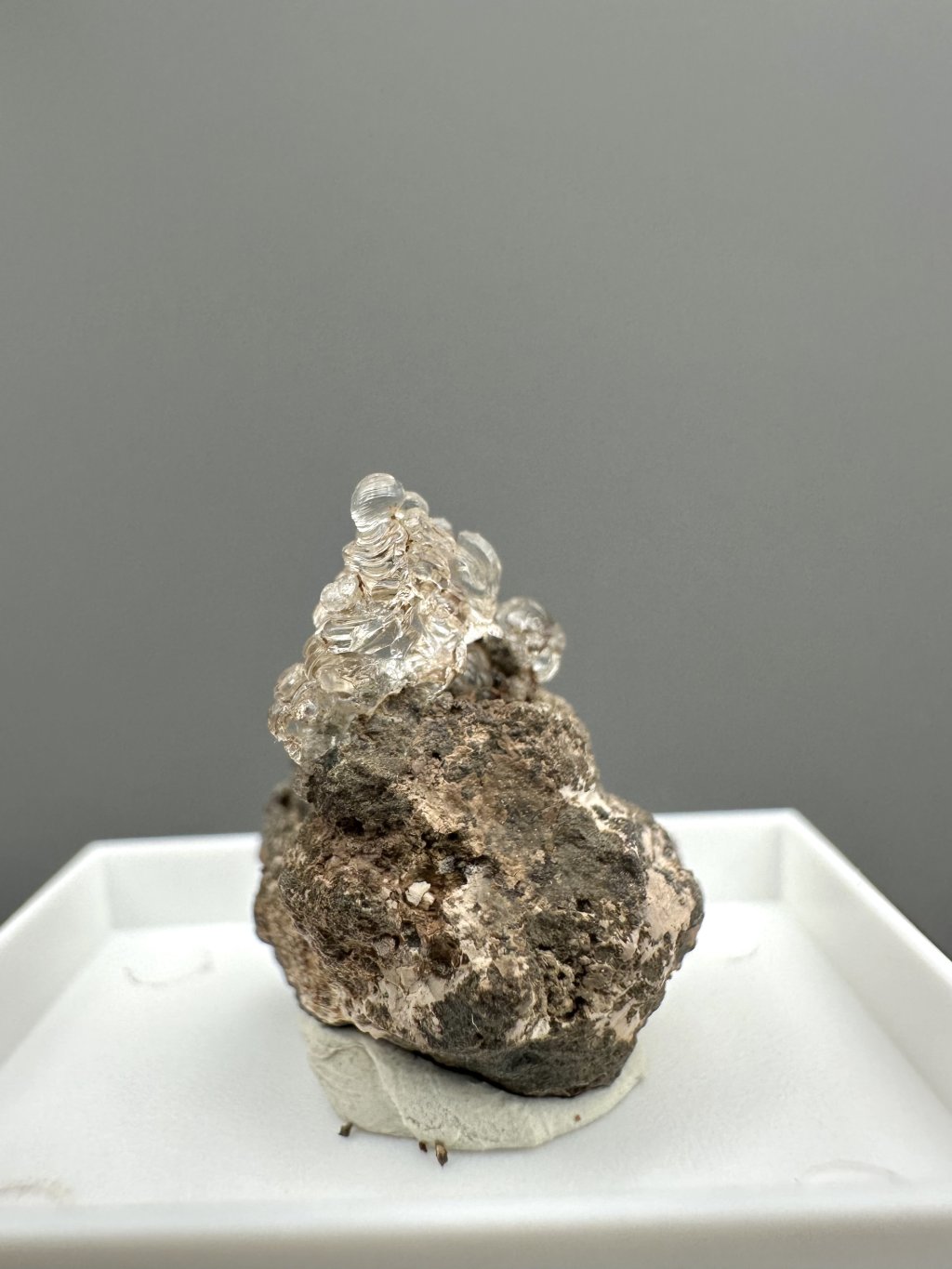 Hyalit, auch als Glasopal bekannt, ist eine Opalart, die sich durch ihre klare, farblose bis leicht gefärbte Struktur und ihren charakteristischen Glasglanz auszeichnet. Dieses Mineral besteht aus Kieselsäure (SiO₂) und enthält Wasser, was ihm seine einzigartigen Eigenschaften verleiht. Hyalit entsteht durch hydrothermale Prozesse nahe der Erdoberfläche, häufig in den Hohlräumen von Eruptivgestein wie Basalt. In der Tschechischen Republik gibt es ein bedeutendes Hyalitvorkommen in der Nähe von Valec, wo es in Form von trauben- oder stalaktitartigen Aggregaten auftritt.