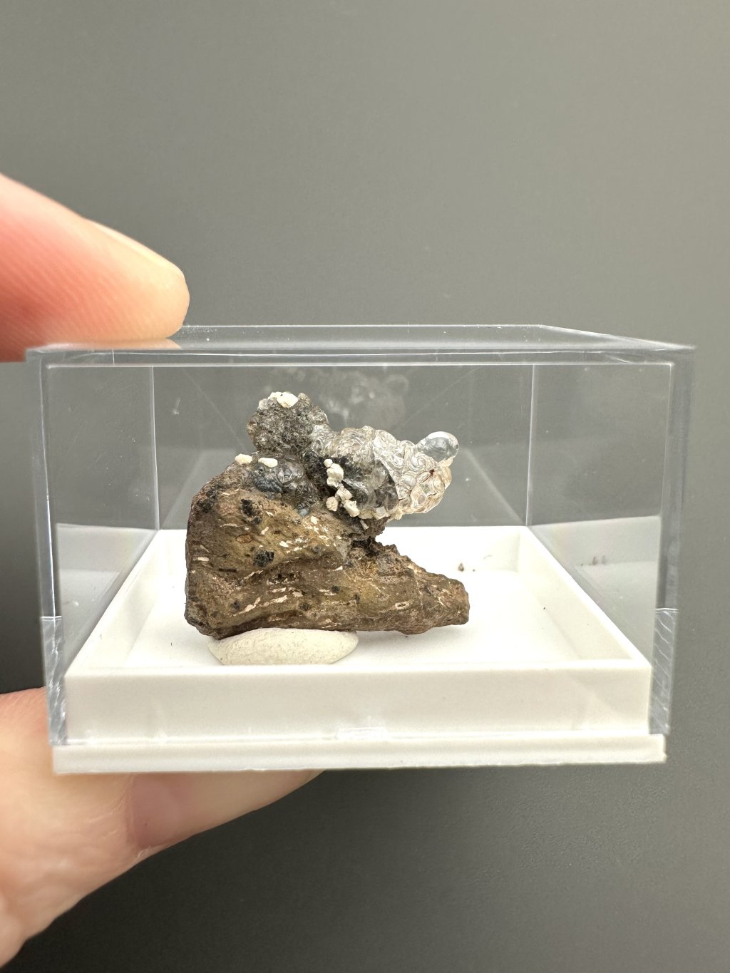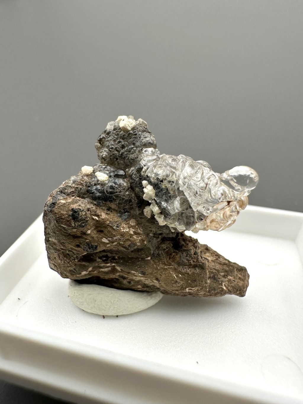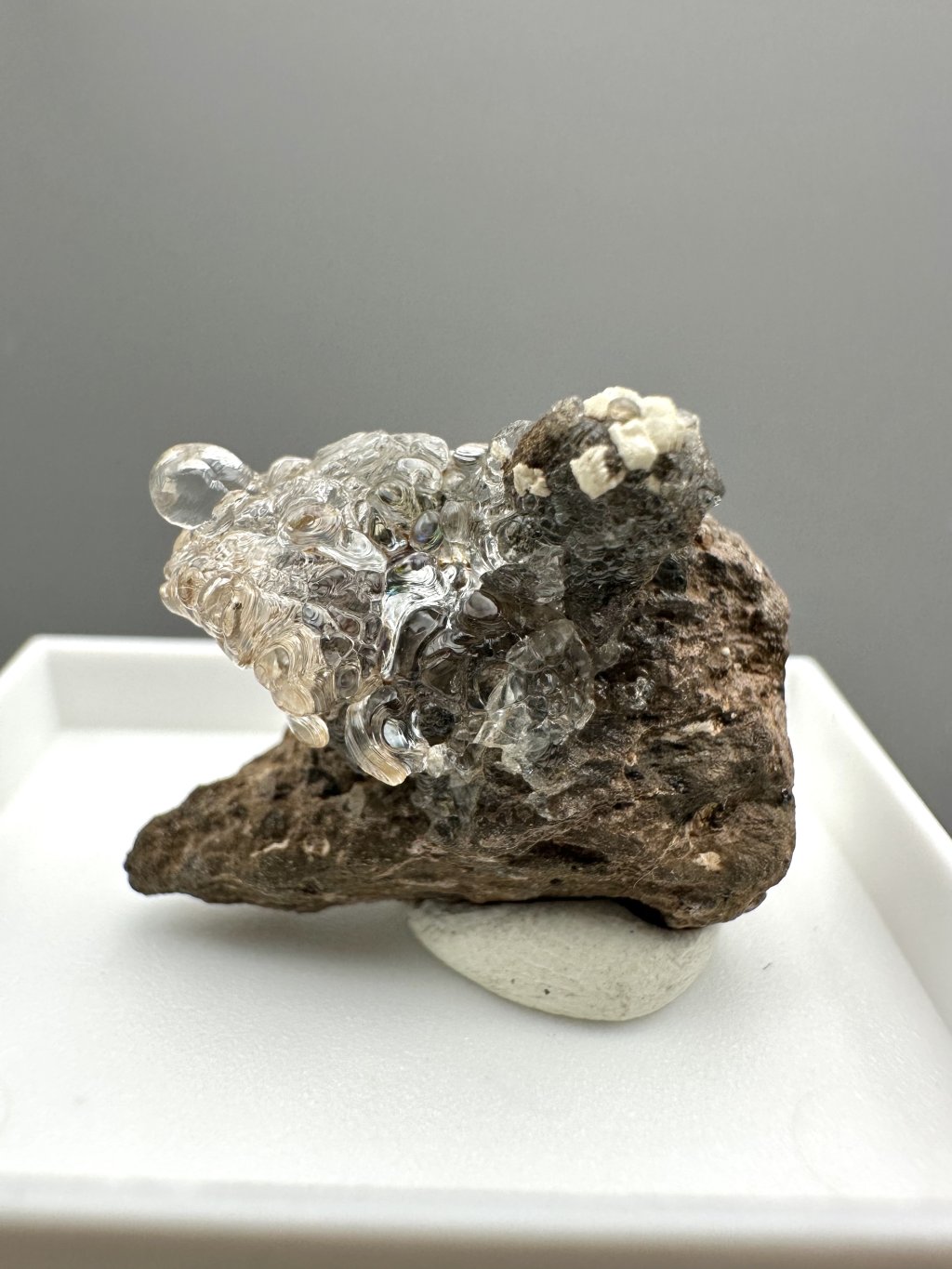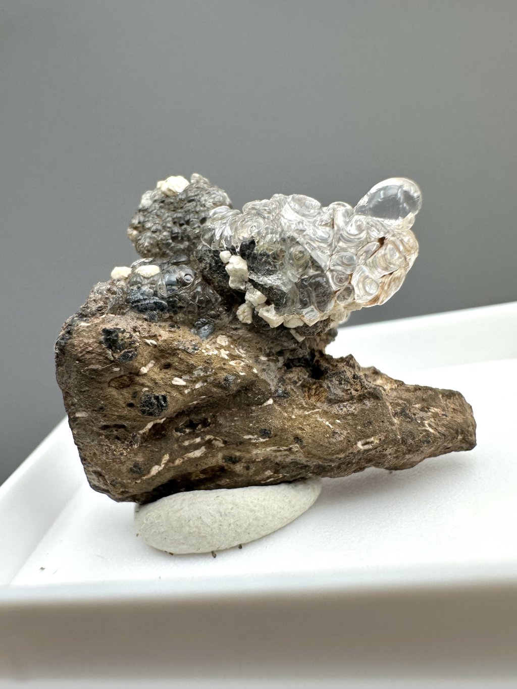 Hyalit, auch als Glasopal bekannt, ist eine Opalart, die sich durch ihre klare, farblose bis leicht gefärbte Struktur und ihren charakteristischen Glasglanz auszeichnet. Dieses Mineral besteht aus Kieselsäure (SiO₂) und enthält Wasser, was ihm seine einzigartigen Eigenschaften verleiht. Hyalit entsteht durch hydrothermale Prozesse nahe der Erdoberfläche, häufig in den Hohlräumen von Eruptivgestein wie Basalt. In der Tschechischen Republik gibt es ein bedeutendes Hyalitvorkommen in der Nähe von Valec, wo es in Form von trauben- oder stalaktitartigen Aggregaten auftritt.