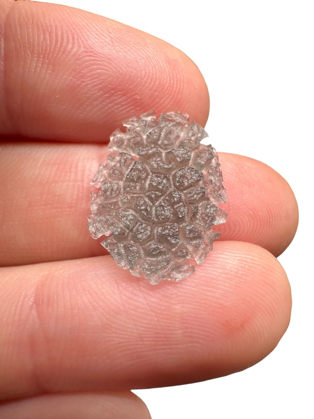Dieser kürzlich entdeckte Obsidian-Typ gehört zu den schönsten Obsidiangesteinen der Welt. Er unterscheidet sich von anderen Obsidianarten durch seine ausgeprägt tiefe Struktur, die an südböhmische Moldavite erinnert (insbesondere an die Besednice Jezkovna). Seine Skulptur entstand durch schnelles Abkühlen, Aufreißen der Oberfläche und anschließende langsame Einwirkung von Bodensäuren an der jeweiligen Fundstelle – ähnlich wie bei Moldaviten. Die genaue Fundstelle wird derzeit aus Schutzgründen geheim gehalten, um Raubgrabungen und mögliche Zerstörungen der Landschaft zu verhindern. Wir glauben, dass das weltweite Interesse an diesem seltenen und ästhetisch ansprechenden Obsidian rapide zunehmen wird, sobald die genaue Lokalität offengelegt und wissenschaftlich untersucht wird – insbesondere aufgrund seines hohen Potenzials für die Verwendung in der Schmuckindustrie.