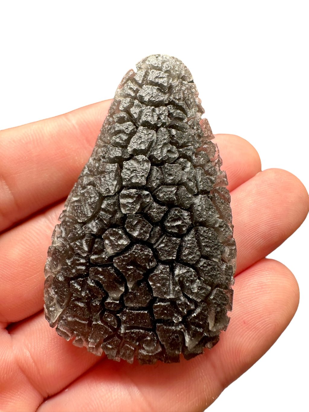 Dieser kürzlich entdeckte Obsidian-Typ gehört zu den schönsten Obsidiangesteinen der Welt. Er unterscheidet sich von anderen Obsidianarten durch seine ausgeprägt tiefe Struktur, die an südböhmische Moldavite erinnert (insbesondere an die Besednice Jezkovna). Seine Skulptur entstand durch schnelles Abkühlen, Aufreißen der Oberfläche und anschließende langsame Einwirkung von Bodensäuren an der jeweiligen Fundstelle – ähnlich wie bei Moldaviten. Die genaue Fundstelle wird derzeit aus Schutzgründen geheim gehalten, um Raubgrabungen und mögliche Zerstörungen der Landschaft zu verhindern. Wir glauben, dass das weltweite Interesse an diesem seltenen und ästhetisch ansprechenden Obsidian rapide zunehmen wird, sobald die genaue Lokalität offengelegt und wissenschaftlich untersucht wird – insbesondere aufgrund seines hohen Potenzials für die Verwendung in der Schmuckindustrie.