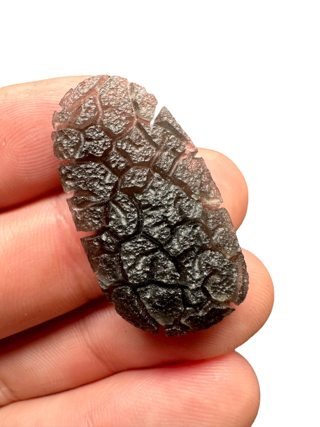 Dieser kürzlich entdeckte Obsidian-Typ gehört zu den schönsten Obsidiangesteinen der Welt. Er unterscheidet sich von anderen Obsidianarten durch seine ausgeprägt tiefe Struktur, die an südböhmische Moldavite erinnert (insbesondere an die Besednice Jezkovna). Seine Skulptur entstand durch schnelles Abkühlen, Aufreißen der Oberfläche und anschließende langsame Einwirkung von Bodensäuren an der jeweiligen Fundstelle – ähnlich wie bei Moldaviten. Die genaue Fundstelle wird derzeit aus Schutzgründen geheim gehalten, um Raubgrabungen und mögliche Zerstörungen der Landschaft zu verhindern. Wir glauben, dass das weltweite Interesse an diesem seltenen und ästhetisch ansprechenden Obsidian rapide zunehmen wird, sobald die genaue Lokalität offengelegt und wissenschaftlich untersucht wird – insbesondere aufgrund seines hohen Potenzials für die Verwendung in der Schmuckindustrie.