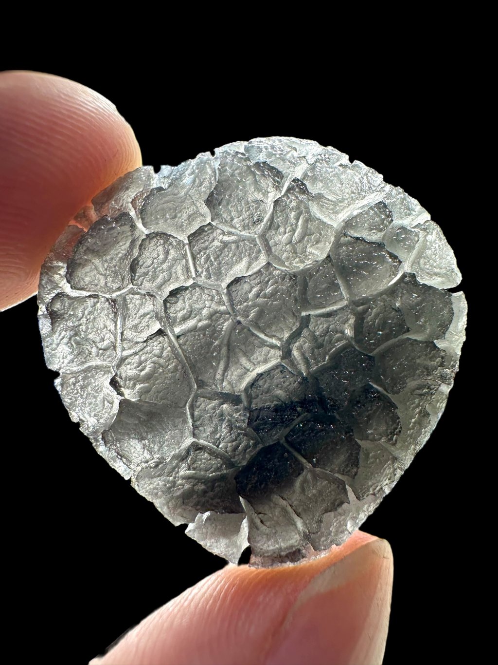 Dieser kürzlich entdeckte Obsidian-Typ gehört zu den schönsten Obsidiangesteinen der Welt. Er unterscheidet sich von anderen Obsidianarten durch seine ausgeprägt tiefe Struktur, die an südböhmische Moldavite erinnert (insbesondere an die Besednice Jezkovna). Seine Skulptur entstand durch schnelles Abkühlen, Aufreißen der Oberfläche und anschließende langsame Einwirkung von Bodensäuren an der jeweiligen Fundstelle – ähnlich wie bei Moldaviten. Die genaue Fundstelle wird derzeit aus Schutzgründen geheim gehalten, um Raubgrabungen und mögliche Zerstörungen der Landschaft zu verhindern. Wir glauben, dass das weltweite Interesse an diesem seltenen und ästhetisch ansprechenden Obsidian rapide zunehmen wird, sobald die genaue Lokalität offengelegt und wissenschaftlich untersucht wird – insbesondere aufgrund seines hohen Potenzials für die Verwendung in der Schmuckindustrie.