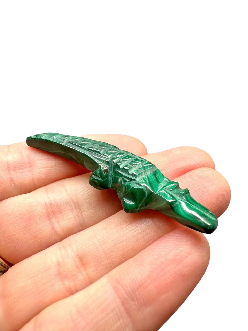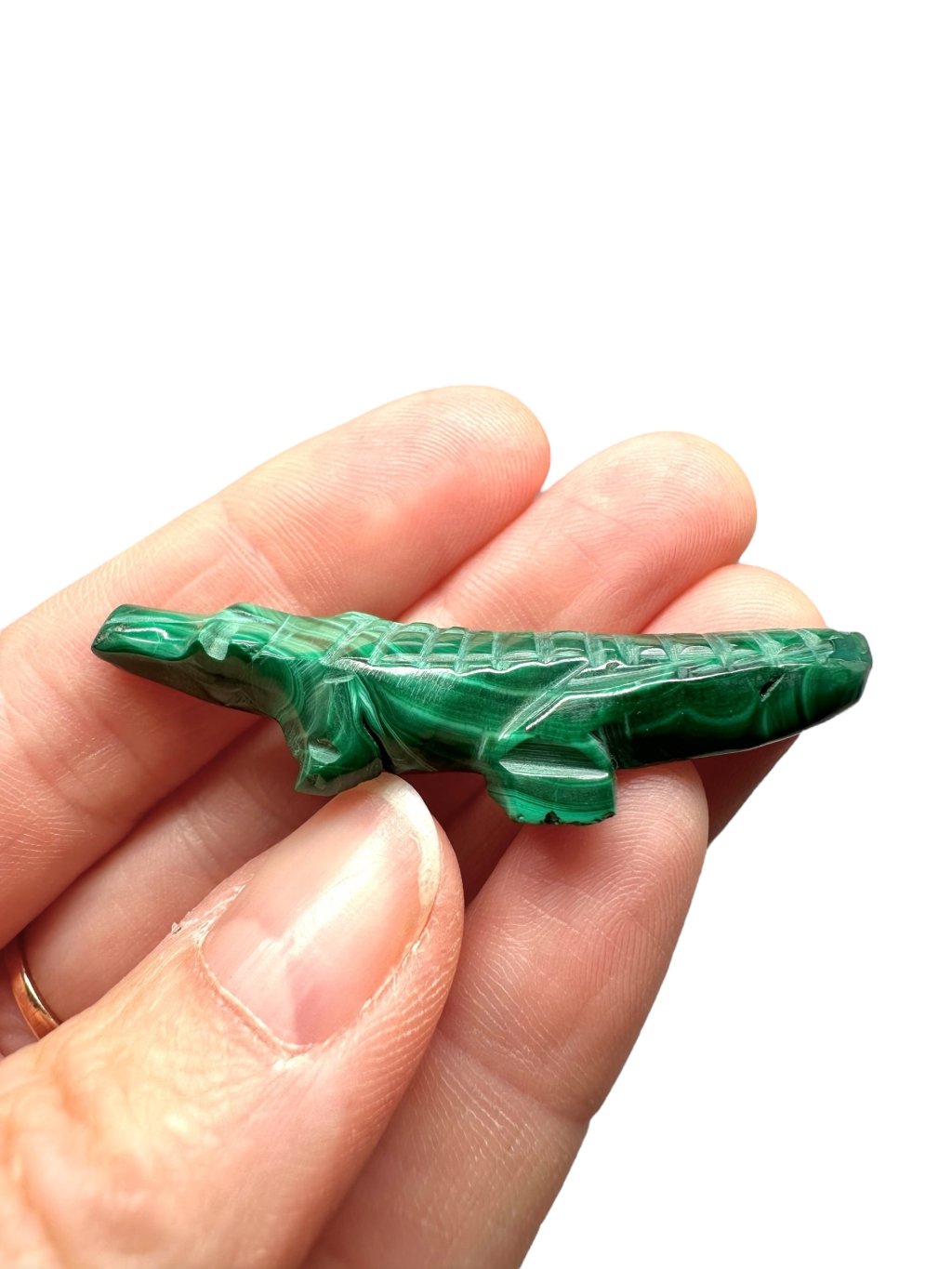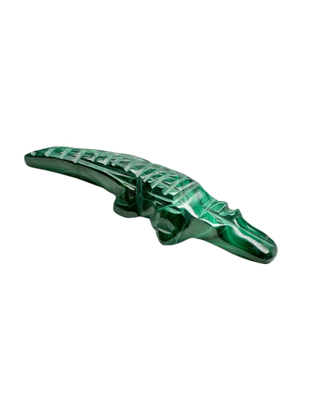 Das Malachittier ist ein dekoratives Objekt aus Malachit, das für seine tiefgrüne Farbe und sein Streifenmuster bekannt ist. Die natürliche Schönheit und Textur von Malachit machen diese Tiere zu beliebten Dekorations- und Sammlerstücken. Sie werden oft in Handarbeit hergestellt, wobei die Kunsthandwerker verschiedene Schattierungen und Streifen des Minerals verwenden, um jedem Tier ein einzigartiges Aussehen zu verleihen.