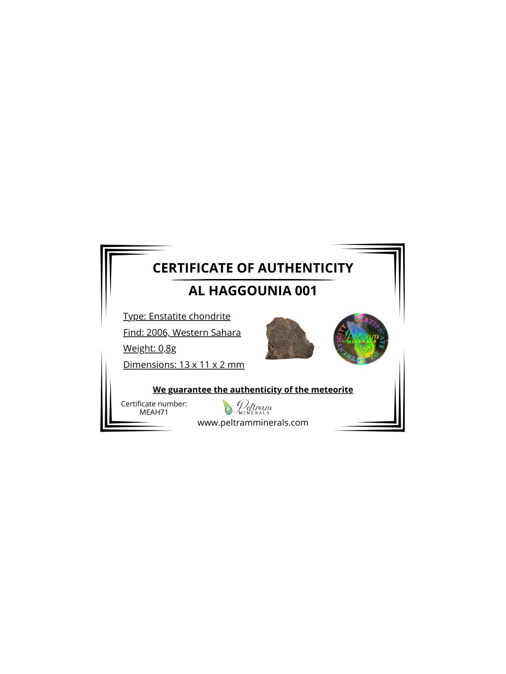 Der Meteorit Al Haggounia 001 wurde im Jahr 2006 entdeckt in der Nähe von Al Haggounia in der Westsahara. Ursprünglich wurde er als Aubrit (ein enstatitreicher Achondrit) eingestuft, spätere Studien stuften ihn jedoch als vesikuläres, unvollständig geschmolzenes Impaktschmelzgestein eines EL-Enstatitchondriten neu ein.