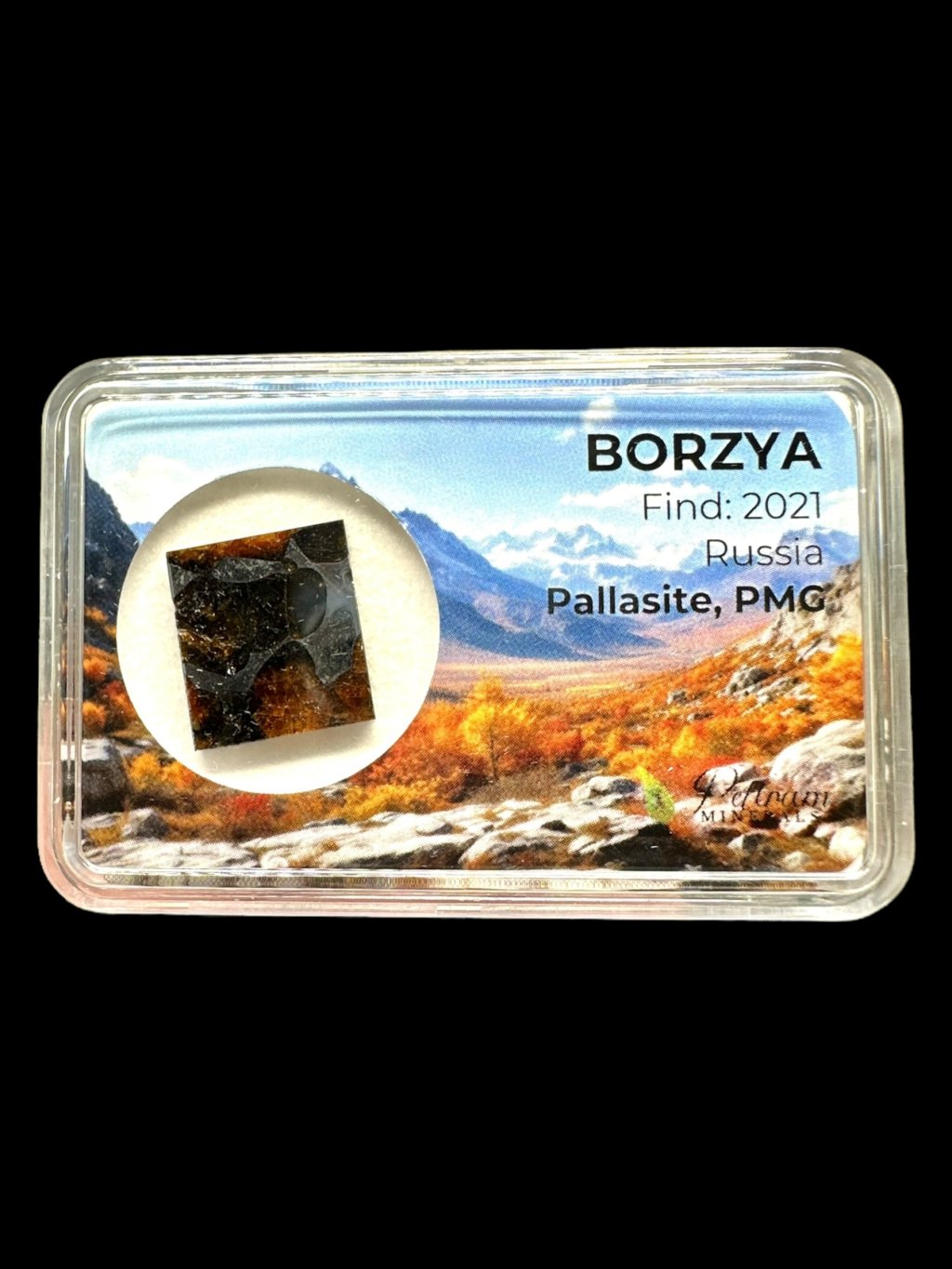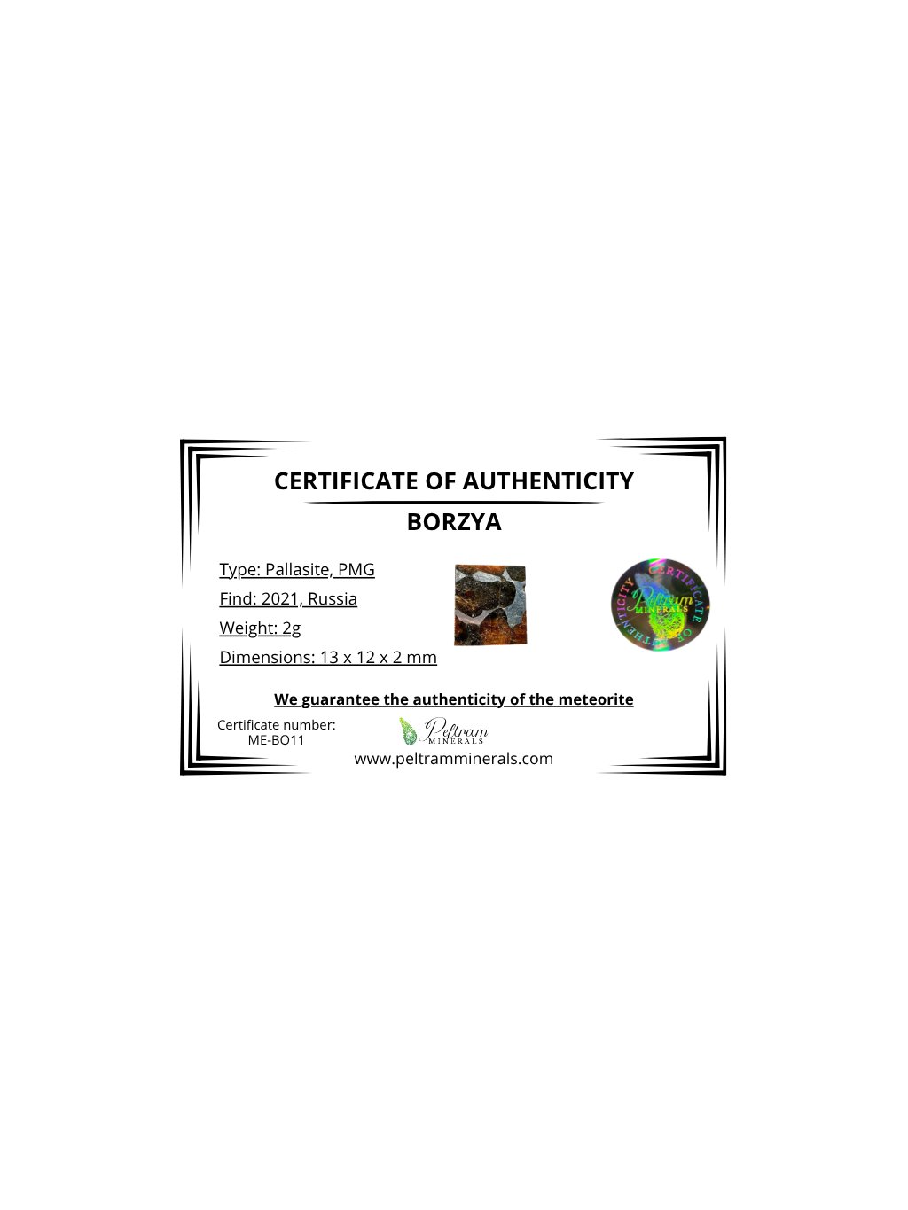 Der Meteorit Borzya wurde im Mai 2021 in der Region Transbaikalien in Russland (nahe der Stadt Borzya) gefunden. Dieser Meteorit wird der Hauptgruppe der Pallasite zugeordnet. Er besteht aus runden Olivinkristallen, die von Eisen-Nickel-Legierungen umgeben sind. Die Olivinkristalle sind größtenteils frei von Einschlüssen, einige enthalten jedoch fein verbundene Chromitnadeln und Calcium-Pyroxen.