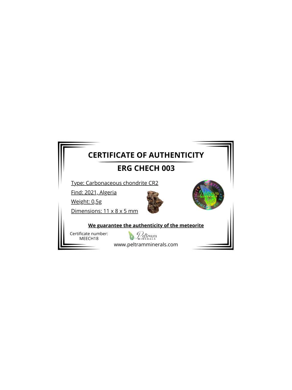 Erg Chech 003 ist ein seltener kohliger Chondrit vom Typ CR2, der 2021 in der Wüstenregion Erg Chech im Gebiet Adrar im Südwesten Algeriens entdeckt wurde. Dieser Meteorit wurde anhand von neun Fragmenten mit einem Gesamtgewicht von etwa 1100 Gramm identifiziert. Die Oberfläche der Fragmente zeigte eine dunkle Schmelzkruste, während frische Schnitte eine markante innere Struktur mit auffälligen, farblich kontrastierenden Chondren in einer feinkörnigen, dunklen und teilweise hydratisierten Matrix offenbarten.