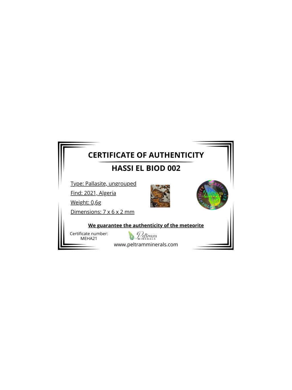 Der Meteorit Hassi el Biod 002 ist ein seltener Pallasit, der im Jahr 2021 in Algerien entdeckt wurde. Die Gesamtmasse des Meteoriten beträgt 10 kg und besteht aus fünf identischen Fragmenten.