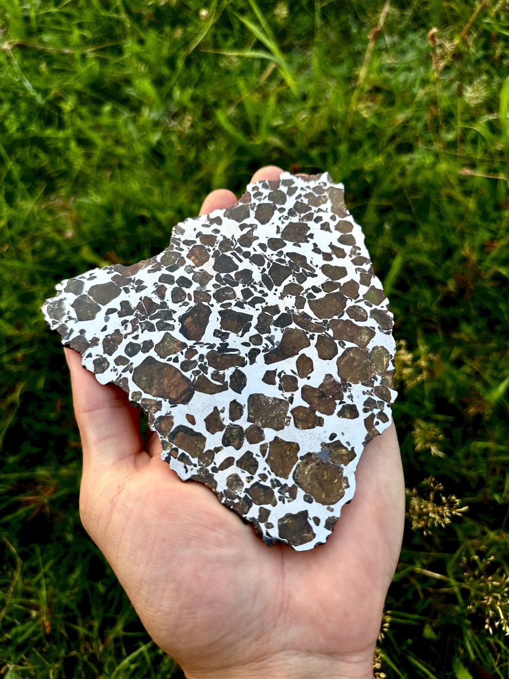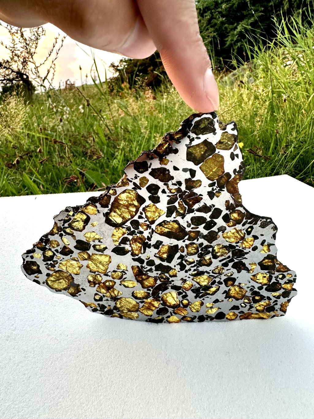 Dieses Stück ist eines der größten Stücke von Imilac, die mit Olivin dieser Qualität und Größe gefunden wurden. Das Stück ist auf beiden Seiten poliert. Der größte Olivin ist über 2 cm groß!