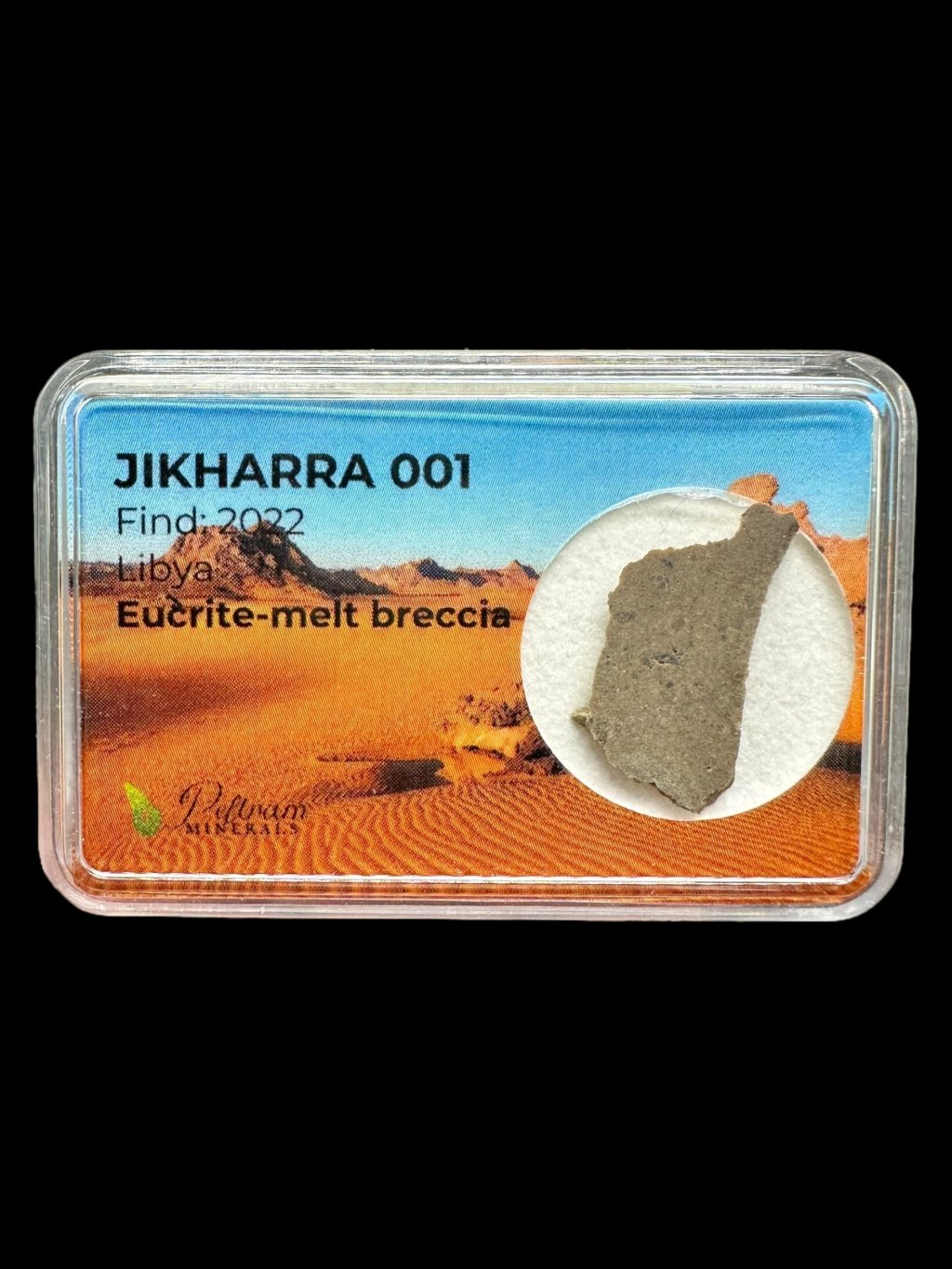 Der Meteorit Jikharra 001 besteht aus lithischen Fragmenten von Plagioklas und Pyroxen, eingebettet in eine durch Schockschmelze entstandene Matrix. Diese Mineralien liefern wertvolle Informationen über geologische Prozesse auf dem Asteroiden 4 Vesta, der als Herkunft der meisten Eucrit-Meteoriten gilt. Vesta ist das zweitgrößte Objekt im Hauptasteroidengürtel und wurde im Laufe seiner Geschichte mehrfach von großen Einschlägen getroffen, wodurch Material ins All geschleudert wurde. Diese Ereignisse schufen Krater auf Vesta, die durch Raumsonden sichtbar gemacht wurden.