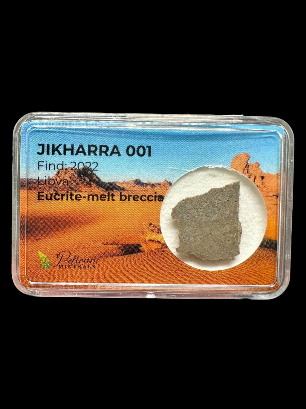 Der Meteorit Jikharra 001 besteht aus lithischen Fragmenten von Plagioklas und Pyroxen, eingebettet in eine durch Schockschmelze entstandene Matrix. Diese Mineralien liefern wertvolle Informationen über geologische Prozesse auf dem Asteroiden 4 Vesta, der als Herkunft der meisten Eucrit-Meteoriten gilt. Vesta ist das zweitgrößte Objekt im Hauptasteroidengürtel und wurde im Laufe seiner Geschichte mehrfach von großen Einschlägen getroffen, wodurch Material ins All geschleudert wurde. Diese Ereignisse schufen Krater auf Vesta, die durch Raumsonden sichtbar gemacht wurden.