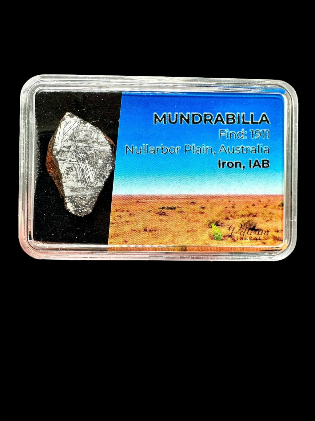 Der Mundrabilla-Meteorit enthält 65-75 % Eisen und Nickel sowie Einschlüsse von Graphit und Silikaten, hauptsächlich Olivin, Pyroxen und Plagioklas. Er ist als Oktaedrit der Klasse IAB eingestuft. Er zeichnet sich durch ausgeprägte Widmanstätten-Muster aus, die sich während der sehr langsamen Abkühlung des Eisen-Nickel-Metalls im Kern des Meteoriten gebildet haben. Diese Muster erscheinen, wenn die Oberfläche mit Säure geätzt und dann poliert wird, um eine Struktur aus Kamakit- und Taenit-Legierungen zu enthüllen.