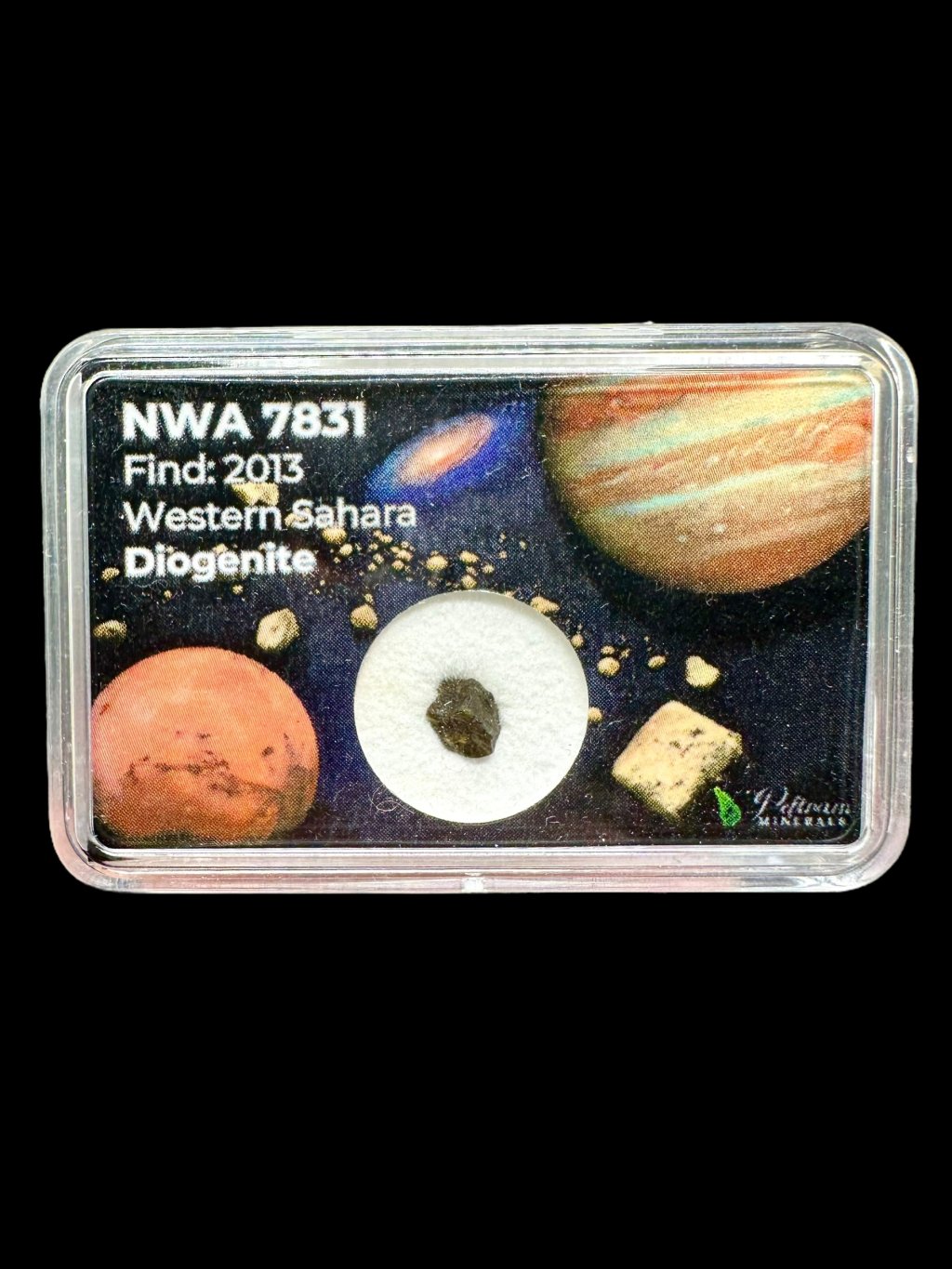 Diogenite, zu denen auch NWA 7831 gehört, sind tiefgründige magmatische Gesteine, die sich tief unter der Oberfläche von Vesta gebildet haben, einem der größten Objekte im Hauptasteroidengürtel zwischen Mars und Jupiter. Vesta gilt als Protoplanet mit differenzierter innerer Struktur, bestehend aus Kern, Mantel und Kruste – ähnlich wie bei erdähnlichen Planeten. Diogenite enthalten einen hohen Anteil an Pyroxen, einem eisen- und magnesiumreichen Mineral, und oft auch kleinere Mengen an Olivin und Plagioklas.