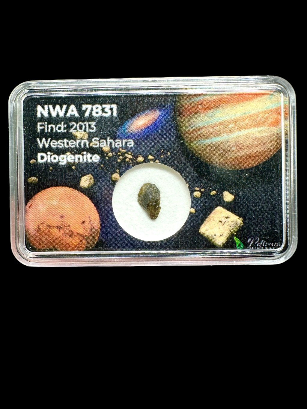 Diogenite, zu denen auch NWA 7831 gehört, sind tiefgründige magmatische Gesteine, die sich tief unter der Oberfläche von Vesta gebildet haben, einem der größten Objekte im Hauptasteroidengürtel zwischen Mars und Jupiter. Vesta gilt als Protoplanet mit differenzierter innerer Struktur, bestehend aus Kern, Mantel und Kruste – ähnlich wie bei erdähnlichen Planeten. Diogenite enthalten einen hohen Anteil an Pyroxen, einem eisen- und magnesiumreichen Mineral, und oft auch kleinere Mengen an Olivin und Plagioklas.
