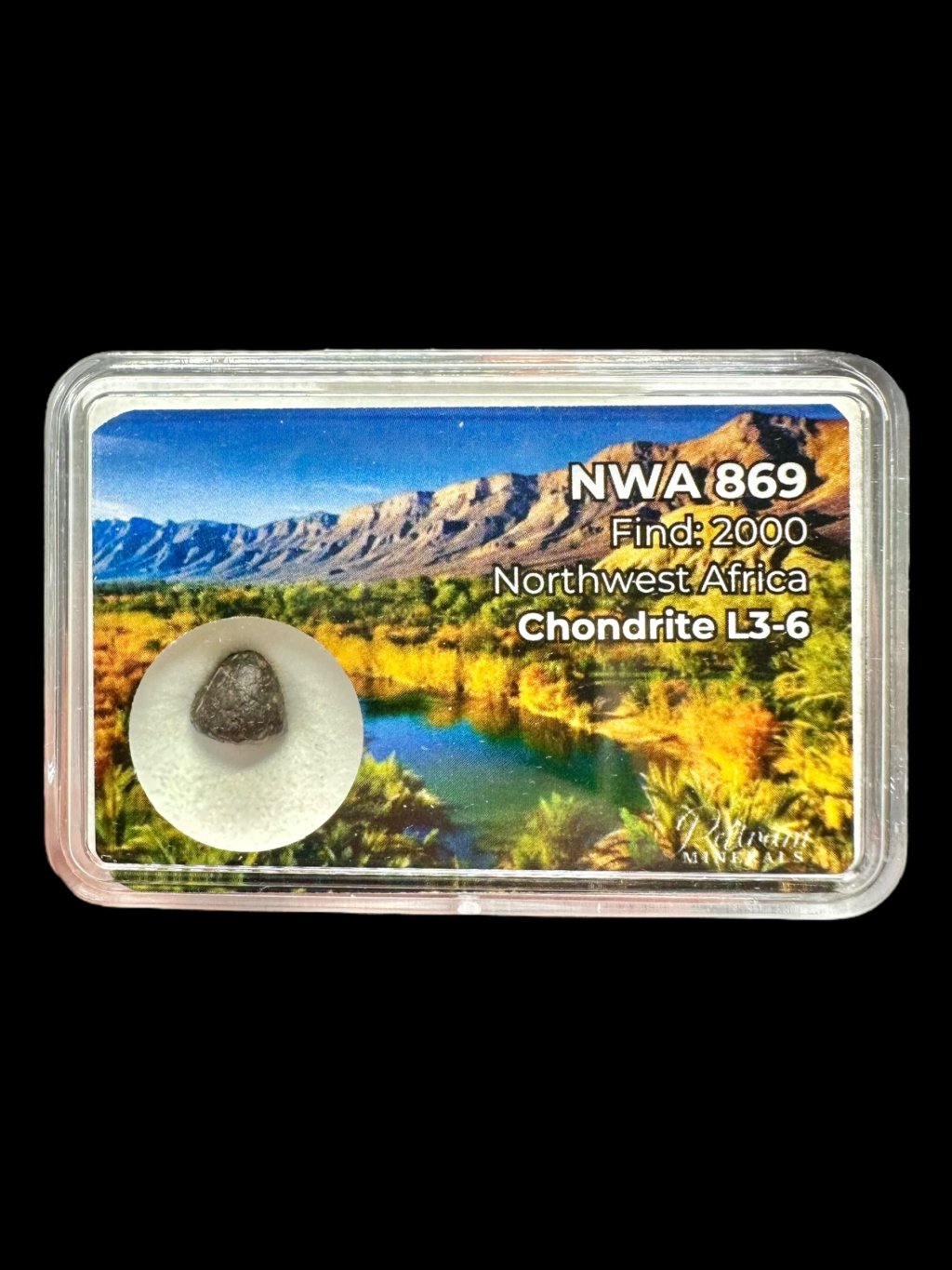 Der Meteorit NWA 869 ist ein gewöhnlicher Chondrit vom Typ L3-6, entdeckt im Jahr 2000 an einem unbekannten Ort in der Sahara. Die Gesamtmasse der gefundenen Fragmente beträgt etwa 2 Tonnen, wobei einzelne Exemplare von wenigen Gramm bis über 20 Kilogramm reichen. Dieser Meteorit ist besonders, da er eine Brekzie enthält, also aus Fragmenten verschiedener Chondrit-Typen besteht und Chondren, Metallpartikel und weitere Einschlüsse enthält. Durch Winderosion wurde bei vielen Proben die Schmelzkruste entfernt oder geglättet, wodurch tiefe Erosionsspuren auf der Oberfläche entstanden sind.