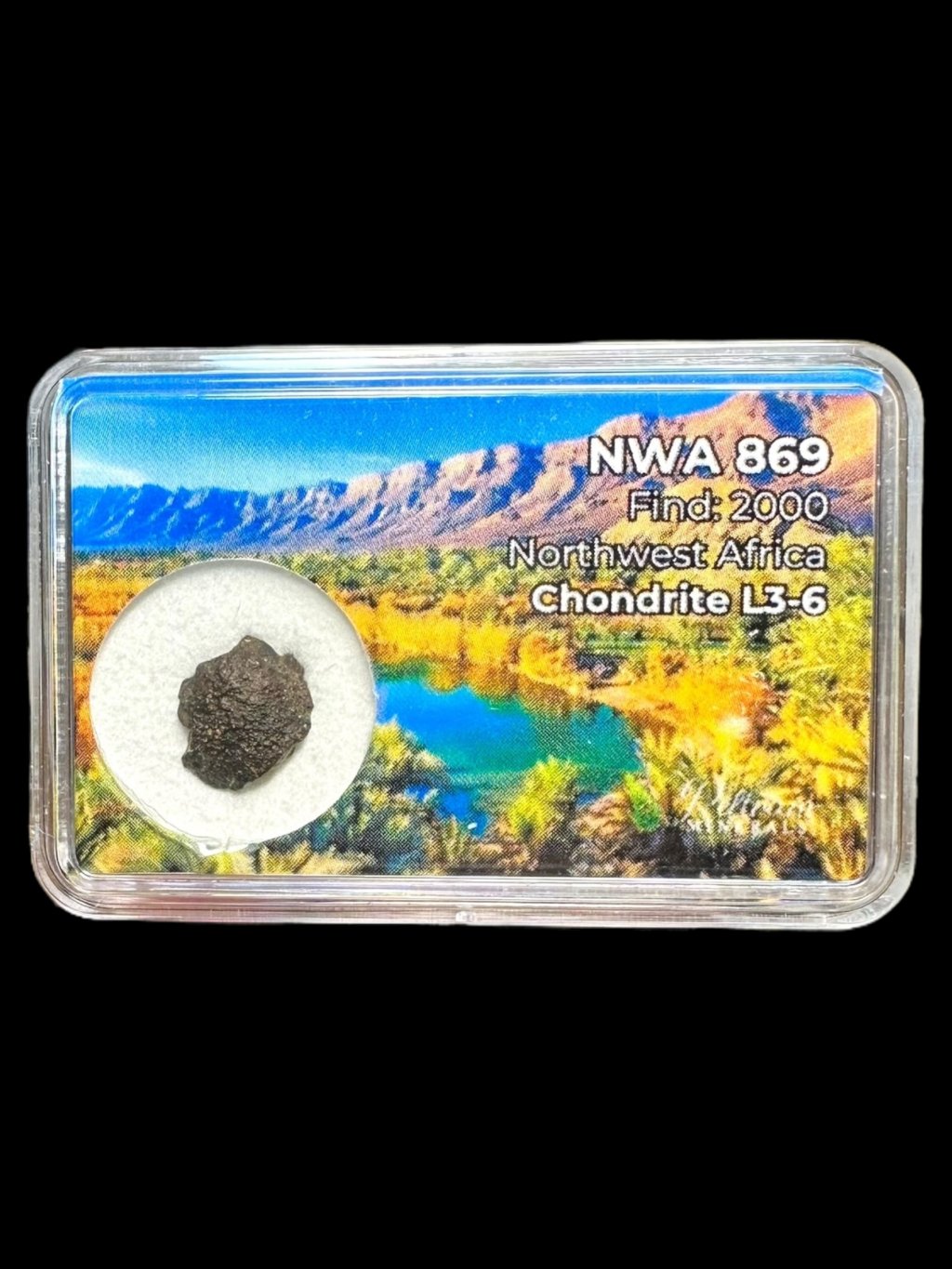 Der Meteorit NWA 869 ist ein gewöhnlicher Chondrit vom Typ L3-6, entdeckt im Jahr 2000 an einem unbekannten Ort in der Sahara. Die Gesamtmasse der gefundenen Fragmente beträgt etwa 2 Tonnen, wobei einzelne Exemplare von wenigen Gramm bis über 20 Kilogramm reichen. Dieser Meteorit ist besonders, da er eine Brekzie enthält, also aus Fragmenten verschiedener Chondrit-Typen besteht und Chondren, Metallpartikel und weitere Einschlüsse enthält. Durch Winderosion wurde bei vielen Proben die Schmelzkruste entfernt oder geglättet, wodurch tiefe Erosionsspuren auf der Oberfläche entstanden sind.