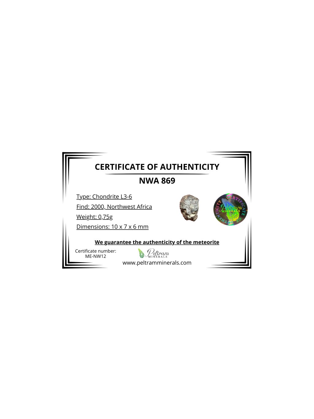 Der Meteorit NWA 869 ist ein gewöhnlicher Chondrit vom Typ L3-6, entdeckt im Jahr 2000 an einem unbekannten Ort in der Sahara. Die Gesamtmasse der gefundenen Fragmente beträgt etwa 2 Tonnen, wobei einzelne Exemplare von wenigen Gramm bis über 20 Kilogramm reichen. Dieser Meteorit ist besonders, da er eine Brekzie enthält, also aus Fragmenten verschiedener Chondrit-Typen besteht und Chondren, Metallpartikel und weitere Einschlüsse enthält. Durch Winderosion wurde bei vielen Proben die Schmelzkruste entfernt oder geglättet, wodurch tiefe Erosionsspuren auf der Oberfläche entstanden sind.