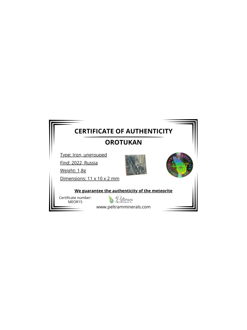 Aufgrund seiner jüngsten Entdeckung sind detaillierte Informationen über den Meteoriten Orotukan derzeit noch begrenzt, was ihn zu einem wissenschaftlich und sammlerisch attraktiven Objekt macht.