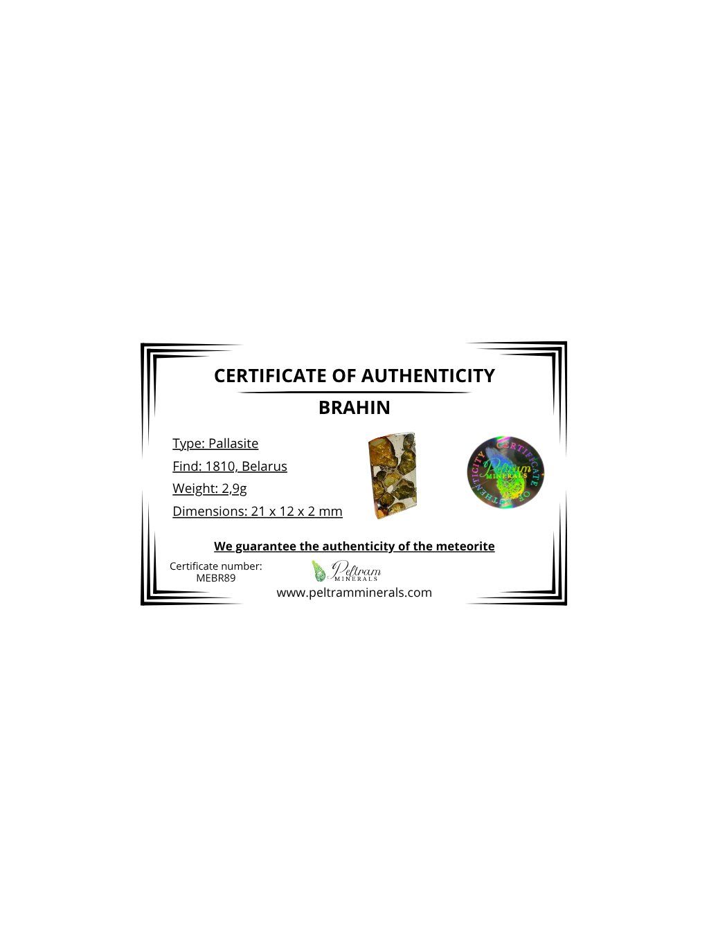 Meteorit Pallasit Brahin 2,9g – Extra Qualität – Belarus