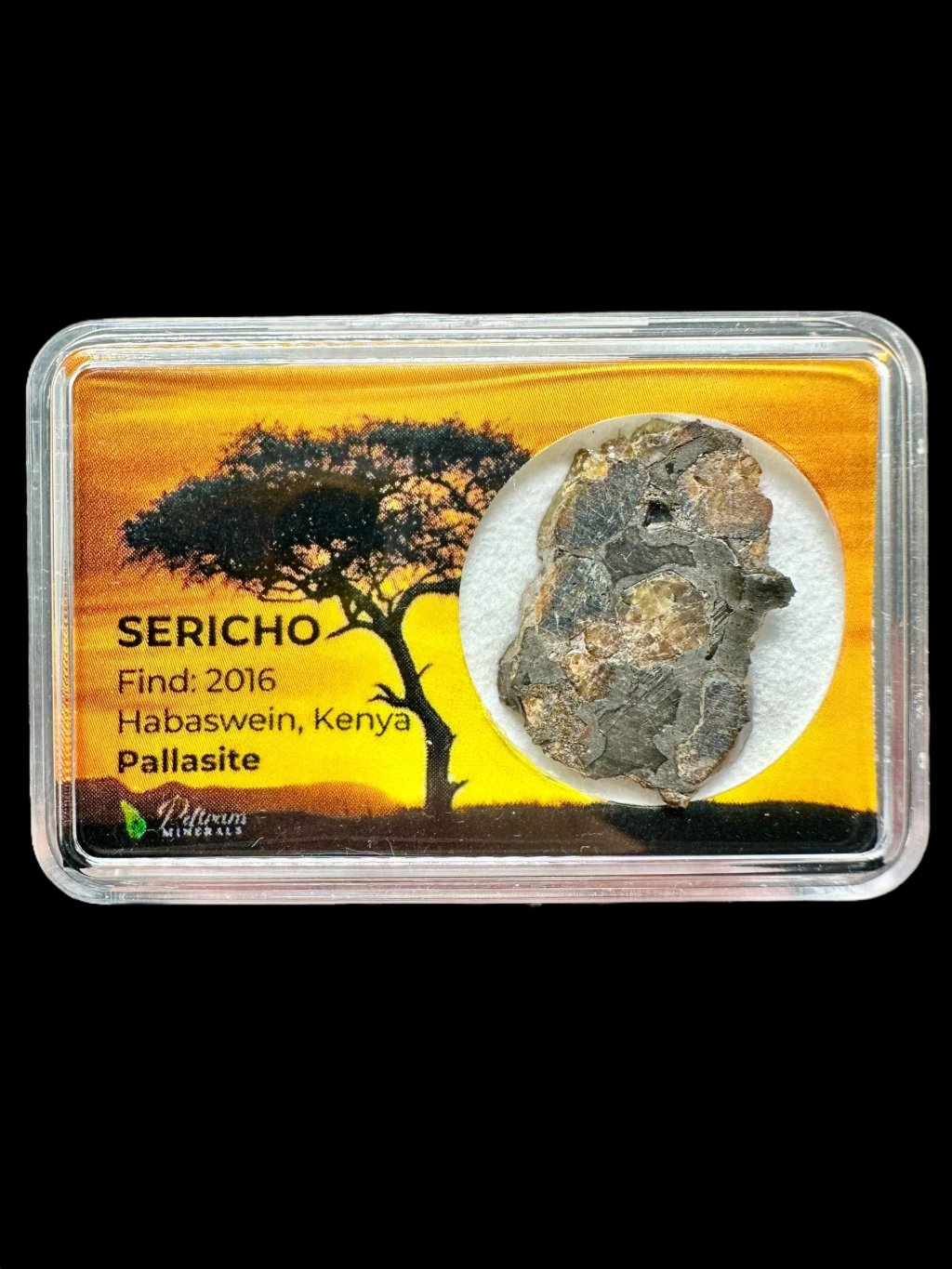 Verteilung: Olivinkristalle sind in das Metall eingebettet und gleichmäßig über den gesamten Meteoriten verstreut. Diese Kombination aus Metall und Olivin verleiht dem Sericho-Meteoriten sein unverwechselbares Aussehen.