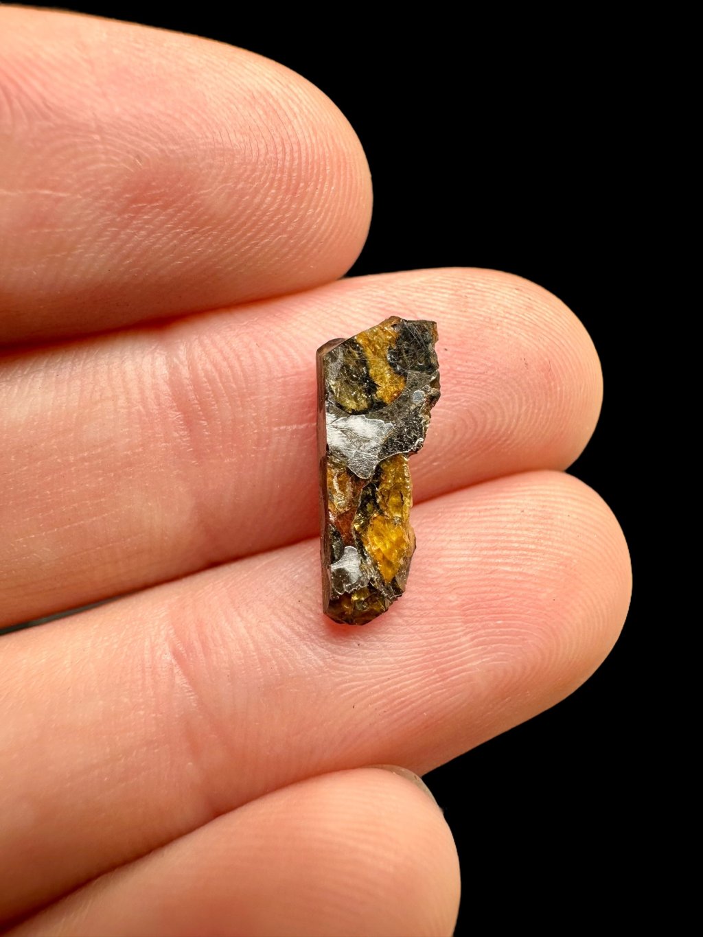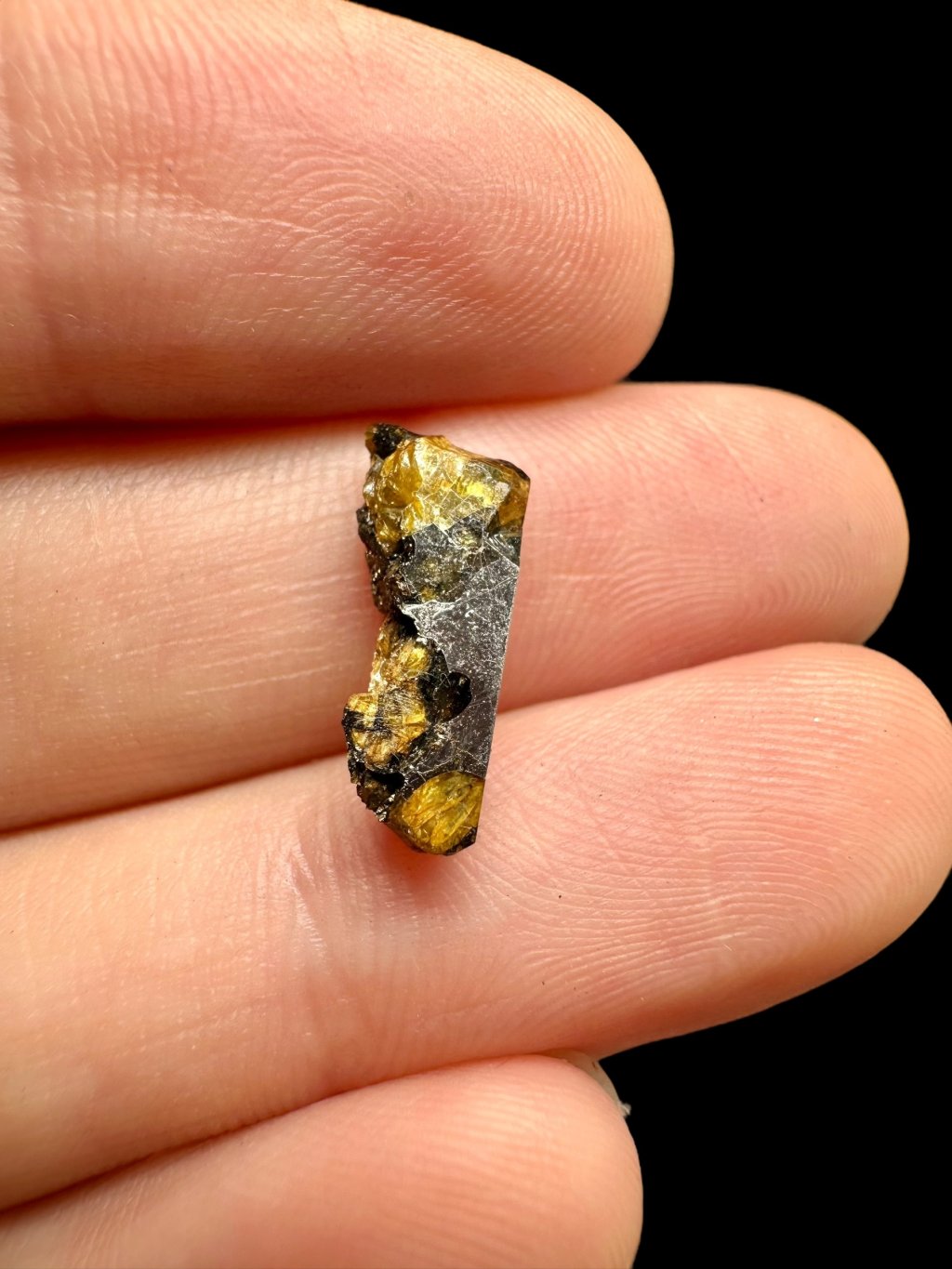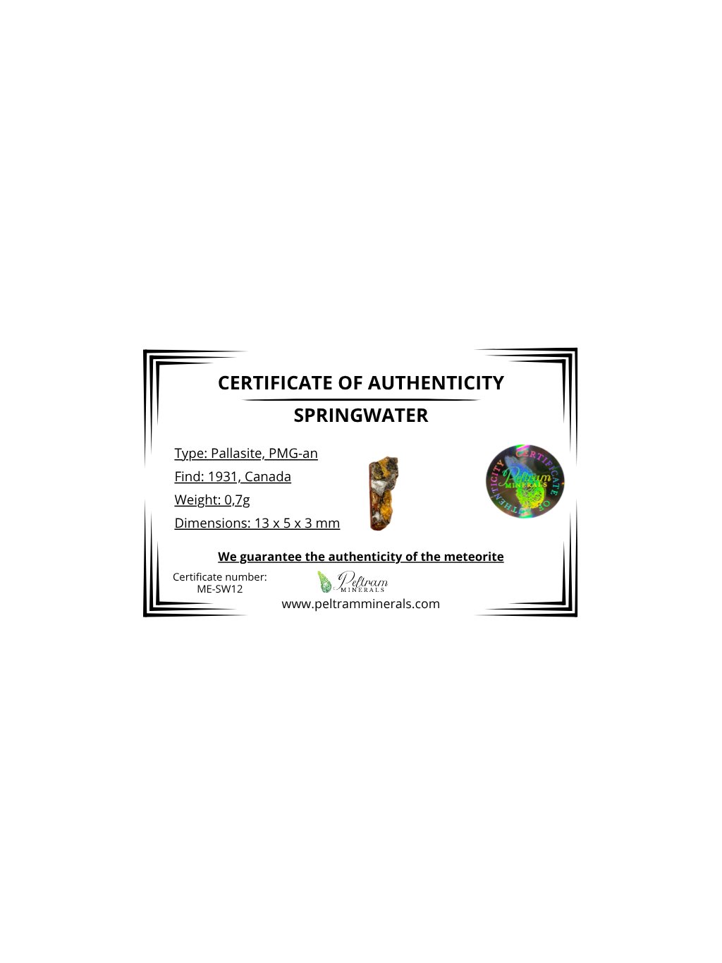 Dieser Stein-Eisen-Meteorit zeichnet sich durch eine bemerkenswerte Struktur aus, in der sich Eisen-Nickel-Legierungen mit Olivinkristallen abwechseln. Diese Olivine sind oft durchsichtig mit einem grün-gelben Farbton und bilden unregelmäßige Einschlüsse in der Metallmatrix. Dieser Kontrast verleiht dem Springwater Meteorit sein ästhetisch eindrucksvolles Erscheinungsbild.