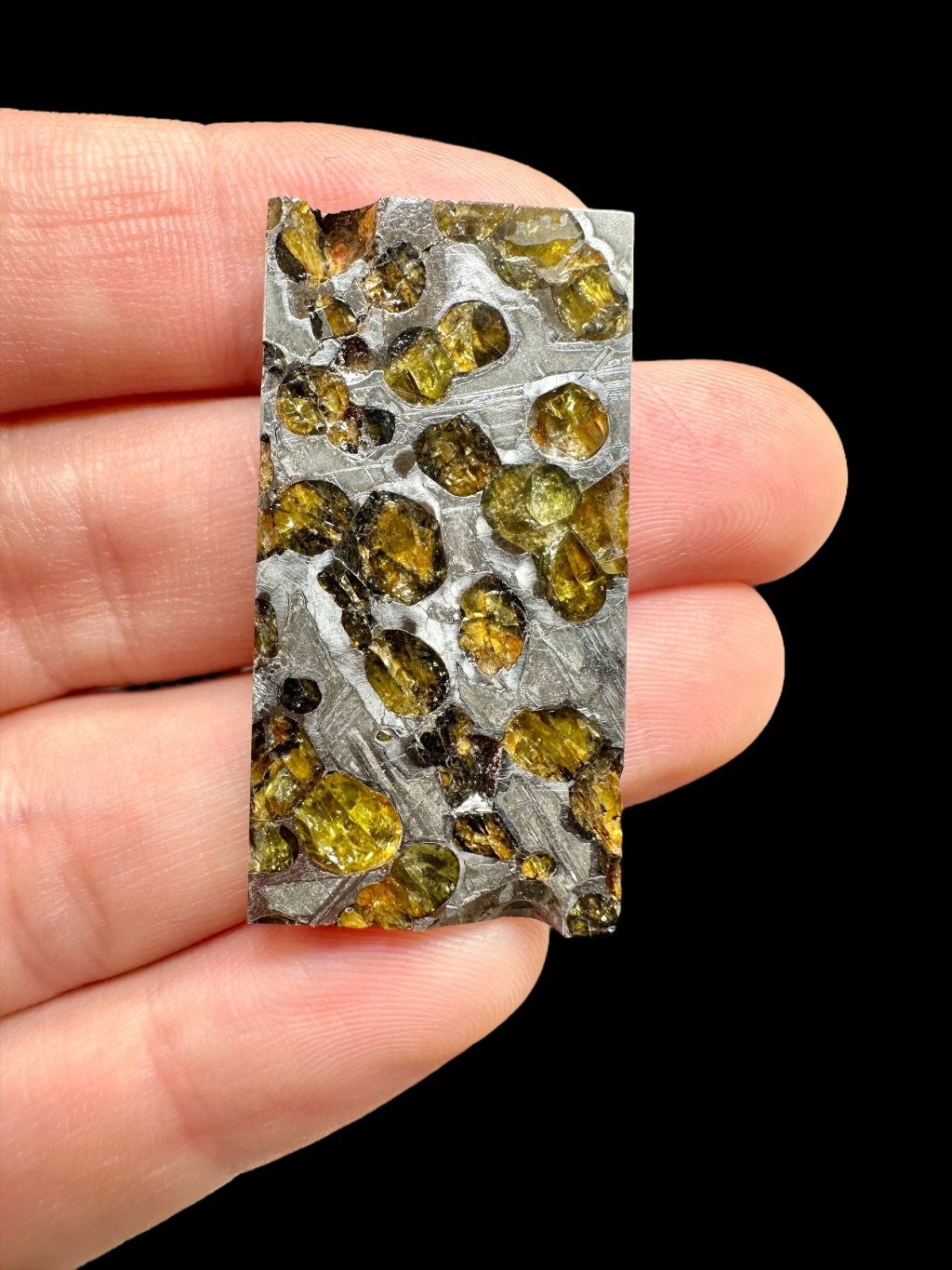 Dieser Stein-Eisen-Meteorit zeichnet sich durch eine bemerkenswerte Struktur aus, in der sich Eisen-Nickel-Legierungen mit Olivinkristallen abwechseln. Diese Olivine sind oft durchsichtig mit einem grün-gelben Farbton und bilden unregelmäßige Einschlüsse in der Metallmatrix. Dieser Kontrast verleiht dem Springwater Meteorit sein ästhetisch eindrucksvolles Erscheinungsbild.