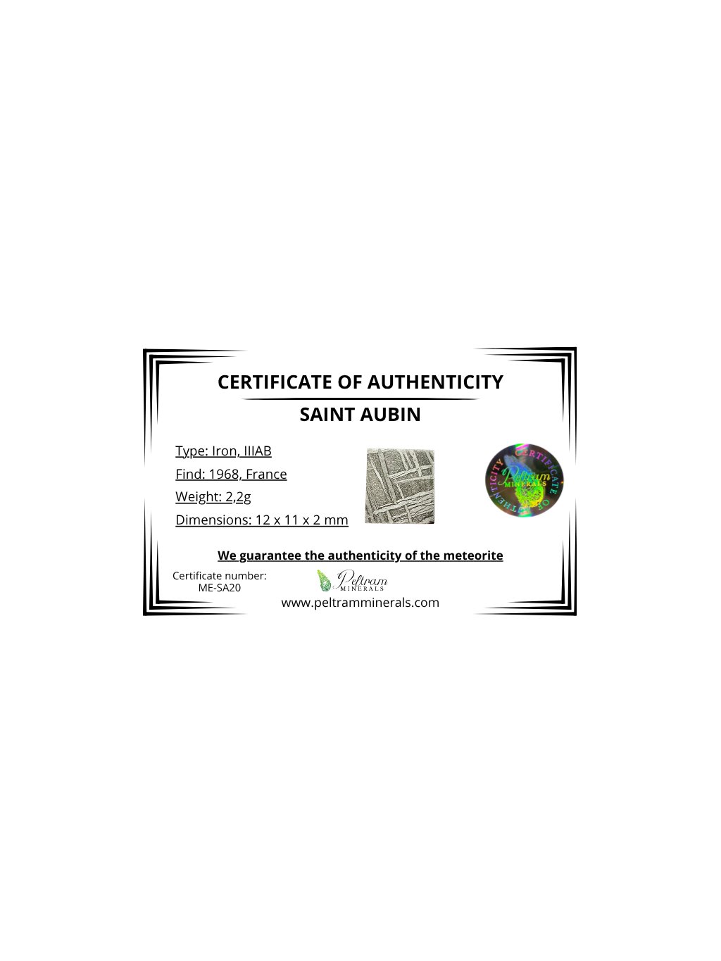 Der Saint-Aubin Meteorit ist ein großer Eisenmeteorit, entdeckt in der Region Saint-Aubin in Frankreich. Er gehört zur Klasse IIIAB, die durch einen hohen Gehalt an Eisen und Nickel gekennzeichnet ist. Man schätzt, dass er vor etwa 55.000 Jahren auf die Erde fiel.