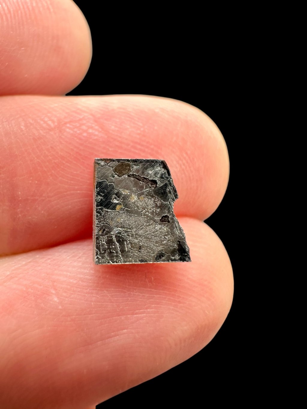 Oberflächenbehandlung: geschliffen, polierter Schnitt (nur auf einer Seite mit Säure geätzt – sichtbare Widmanstätten-Strukturen; die andere Seite ist poliert, aber nicht geätzt)