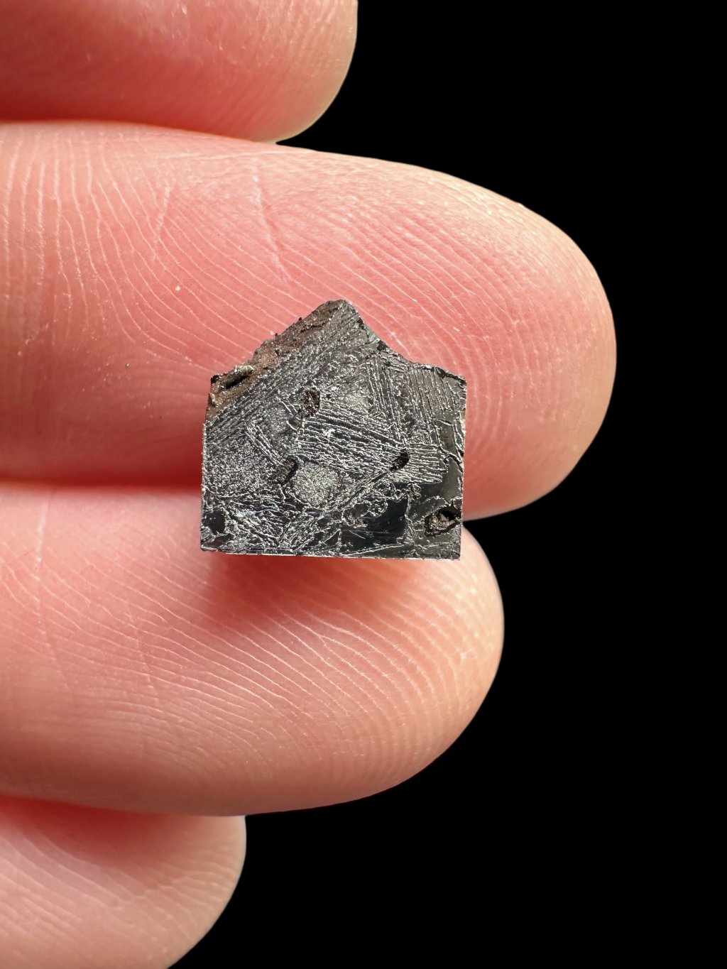 Oberflächenbehandlung: geschliffen, polierter Schnitt (nur auf einer Seite mit Säure geätzt – sichtbare Widmanstätten-Strukturen; die andere Seite ist poliert, aber nicht geätzt)