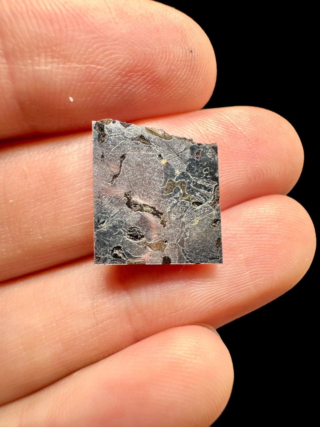 Oberflächenbehandlung: geschliffen, polierter Schnitt (nur auf einer Seite mit Säure geätzt – sichtbare Widmanstätten-Strukturen; die andere Seite ist poliert, aber nicht geätzt)