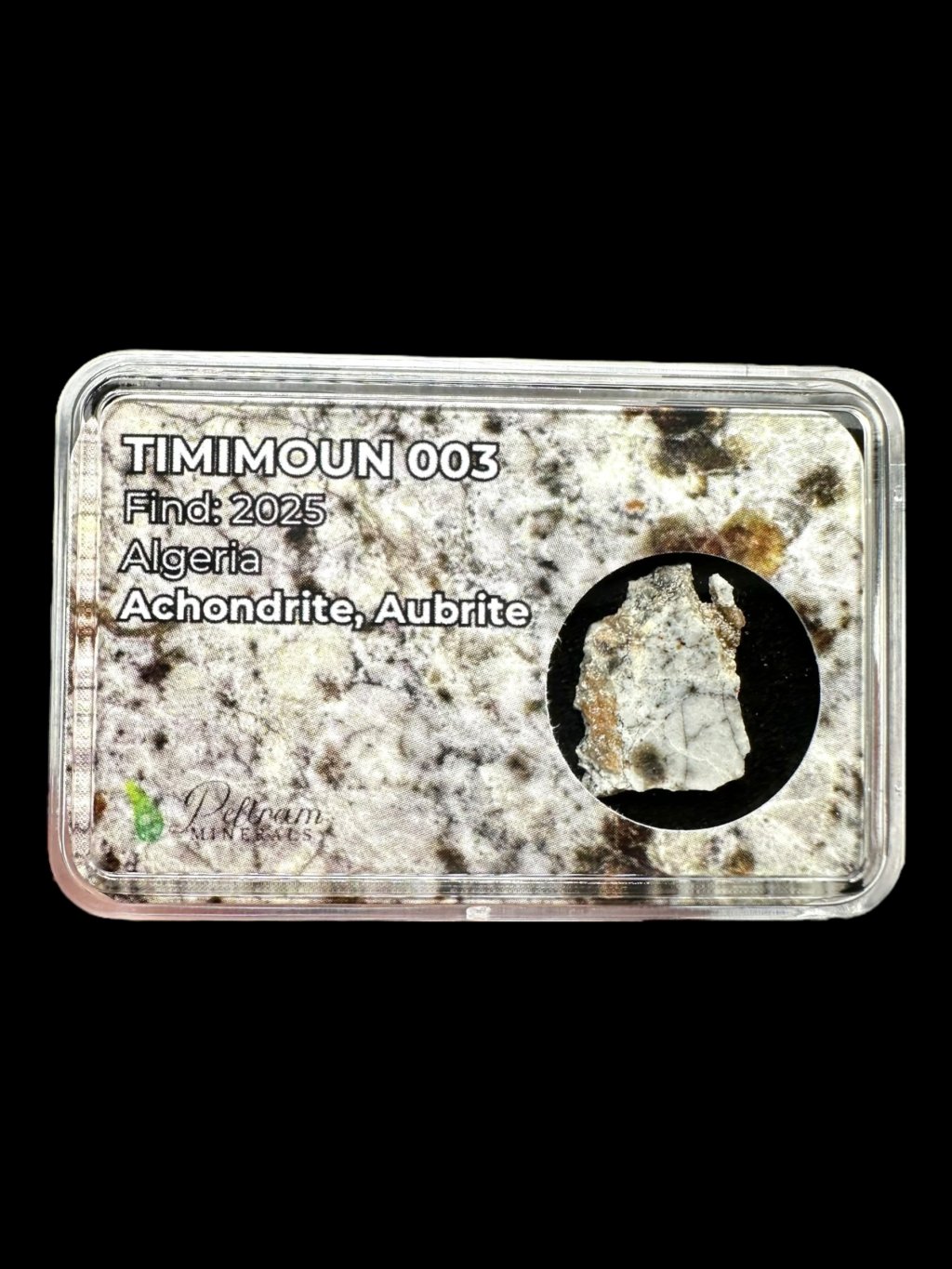 Der Meteorit Timimoun 003 ist einer der neuesten und zugleich ästhetisch ansprechendsten Funde des seltenen Aubrit-Achondriten. Er wurde im Jahr 2025 in der Region Timimoun in der algerischen Sahara entdeckt. Das gesamt bekannte Gewicht des gefundenen Materials beträgt etwa 26 Kilogramm.