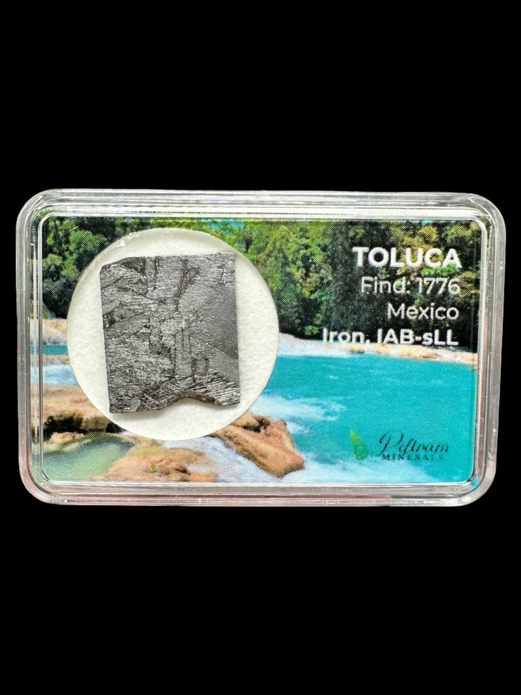 Toluca ist ein Eisenmeteorit, der zur Gruppe der sogenannten Oktaedrite gehört, genauer gesagt zur chemischen Gruppe IAB. Er fällt in die Untergruppe sLL (Subgruppe Low-Au, Low-Ni), was bedeutet, dass er im Vergleich zu anderen IAB-Meteoriten einen geringeren Anteil an Gold und Nickel enthält. Dennoch weist er einen ausreichend hohen Gehalt an Eisen und anderen Metallen auf, was ihm einen charakteristischen metallisch-silbernen Glanz verleiht. Beim Ätzen und Polieren treten die sogenannten Widmanstätten-Strukturen zum Vorschein – typische kristalline Muster, die durch extrem langsames Abkühlen des Metalls im Weltraum entstehen. Aufgrund seines hohen Eisengehalts ist Toluca sehr schwer – selbst ein relativ kleines Fragment kann überraschend viel wiegen. Neben Eisen und Nickel enthält er auch kleinere Mengen anderer Minerale wie Graphit oder Troilit, die gelegentlich kleine Einschlüsse im Material bilden.