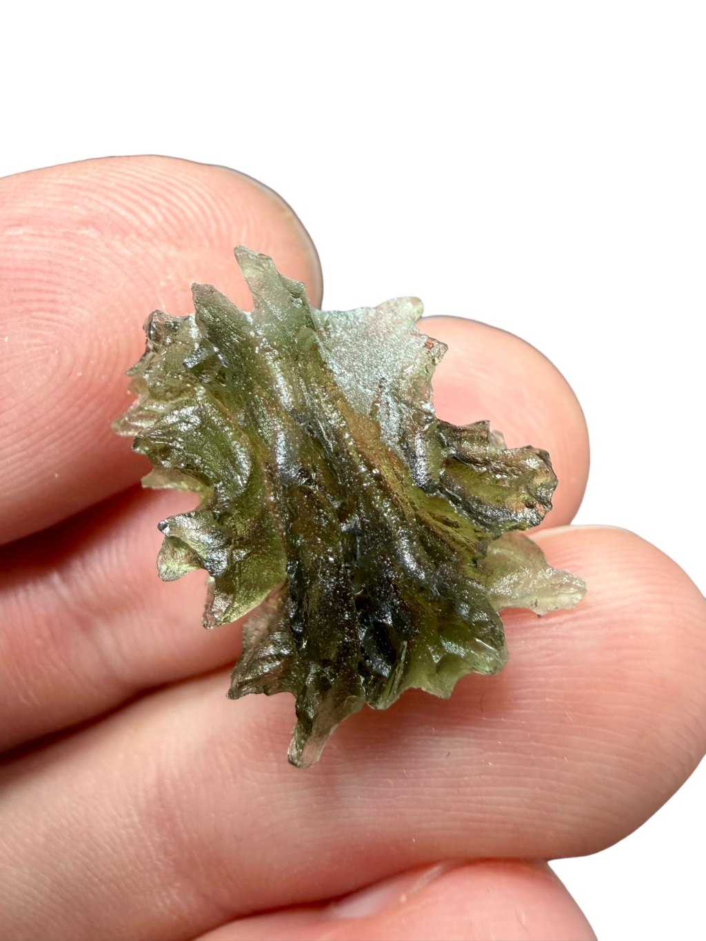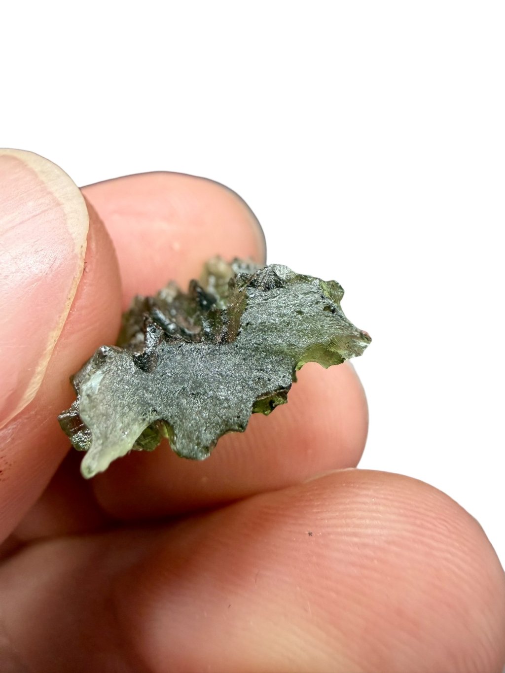 Dieser Moldavite stammt aus dem offiziellen Abbau in Besednice, bei dem es häufig zu Beschädigungen der Steine kam. Die beschädigten glänzenden Flächen wurden anschließend mit Säure mattiert. Solche reparierten Moldavite werden in eine niedrigere Qualitätsklasse eingestuft, was sich auch im Preis widerspiegelt, der im Vergleich zu unbeschädigten Moldaviten deutlich niedriger und erschwinglicher ist. Diese Moldavite eignen sich sowohl für Schmuck als auch für Sammler, die den niedrigeren Preis für sehr schöne Stücke mit der einzigartigen, tiefen Struktur der Moldavite aus der Besednice Jezkovna zu schätzen wissen.