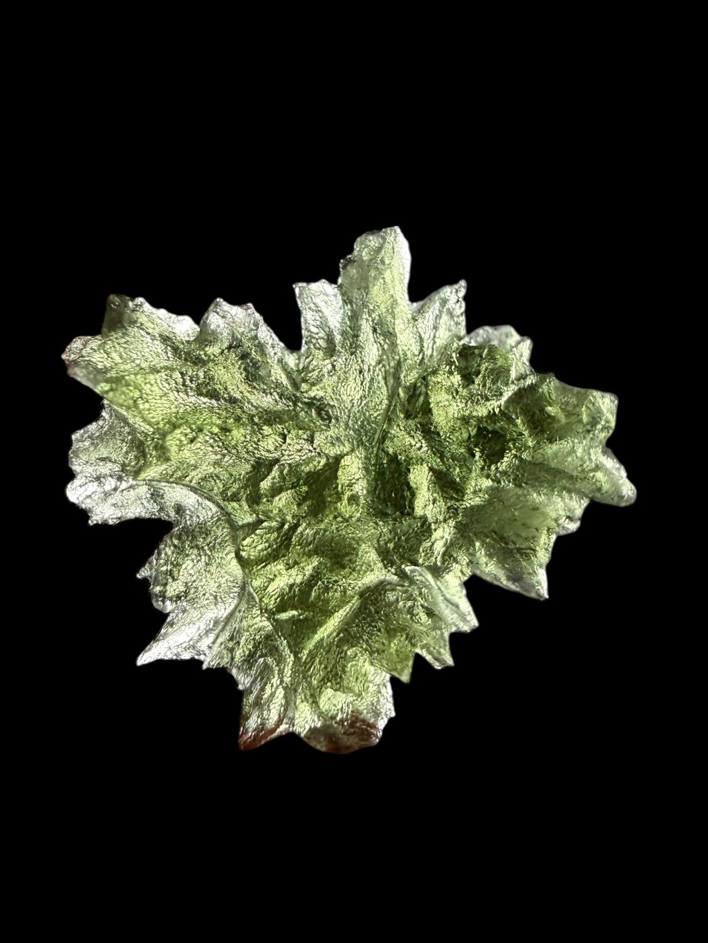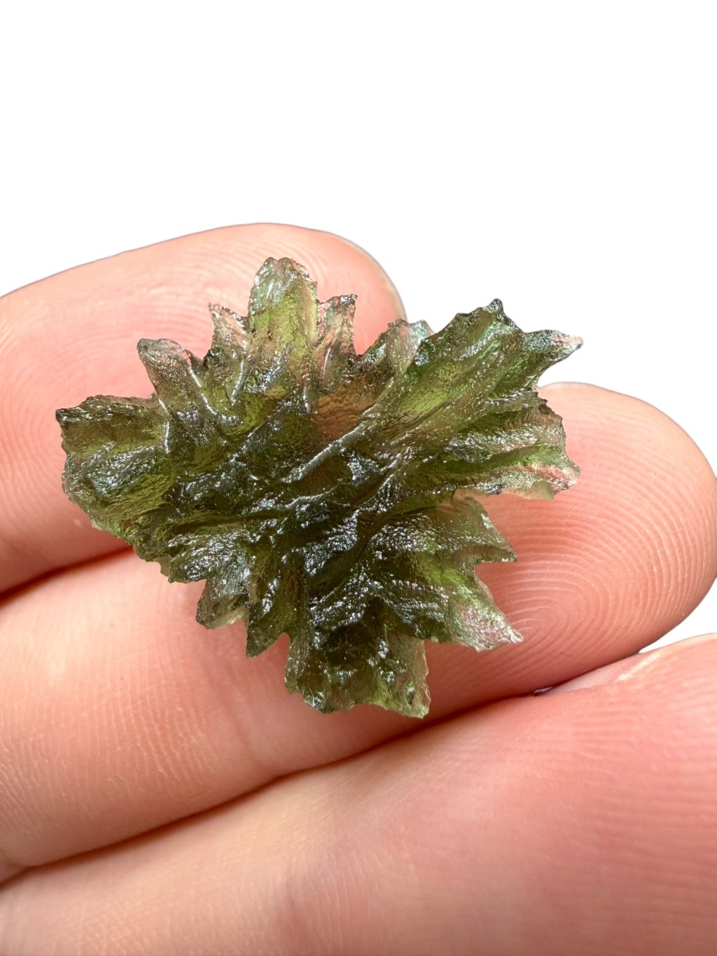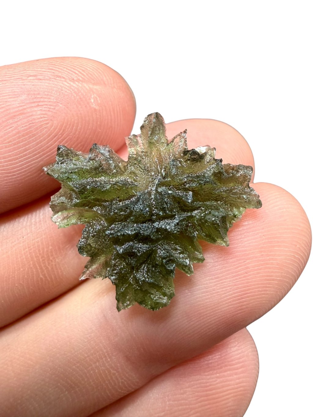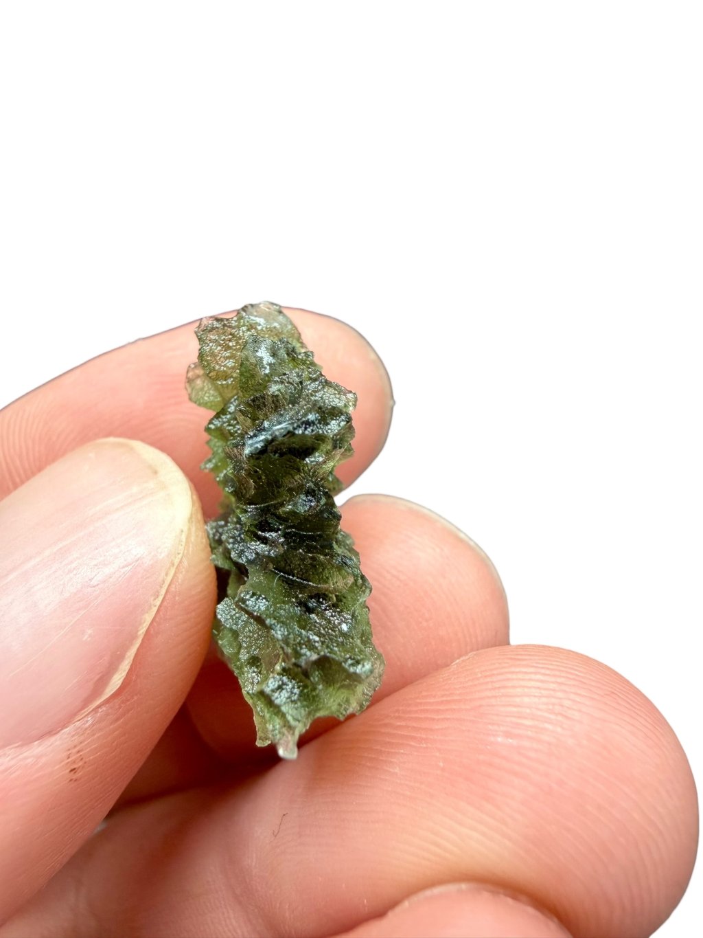 Dieser Moldavite stammt aus dem offiziellen Abbau in Besednice, bei dem es häufig zu Beschädigungen der Steine kam. Die beschädigten glänzenden Flächen wurden anschließend mit Säure mattiert. Solche reparierten Moldavite werden in eine niedrigere Qualitätsklasse eingestuft, was sich auch im Preis widerspiegelt, der im Vergleich zu unbeschädigten Moldaviten deutlich niedriger und erschwinglicher ist. Diese Moldavite eignen sich sowohl für Schmuck als auch für Sammler, die den niedrigeren Preis für sehr schöne Stücke mit der einzigartigen, tiefen Struktur der Moldavite aus der Besednice Jezkovna zu schätzen wissen.