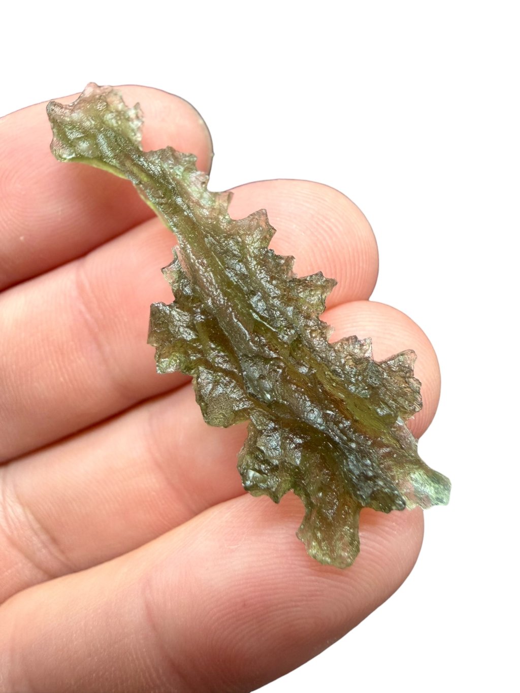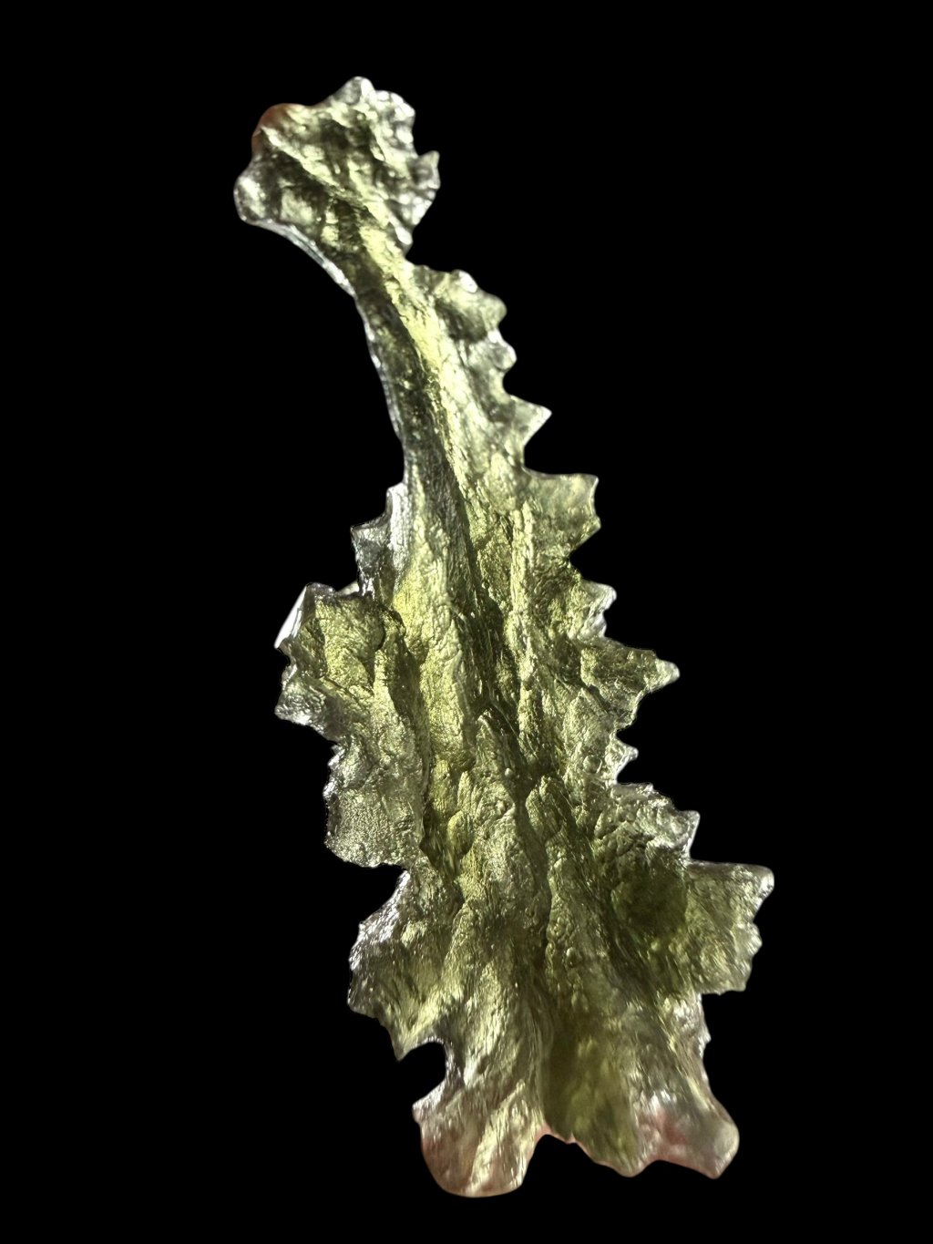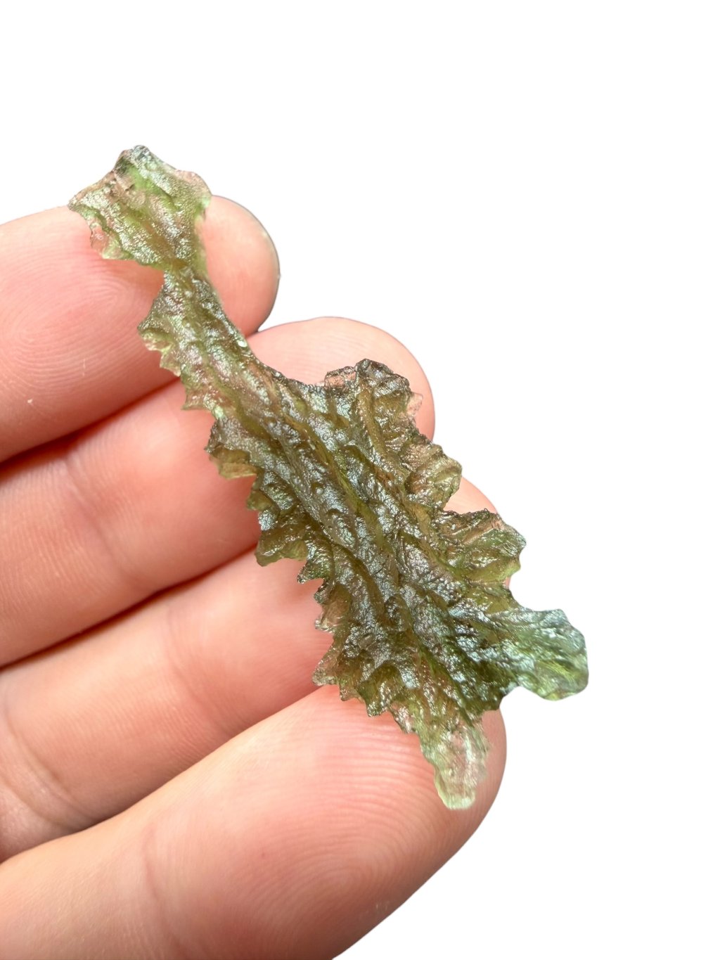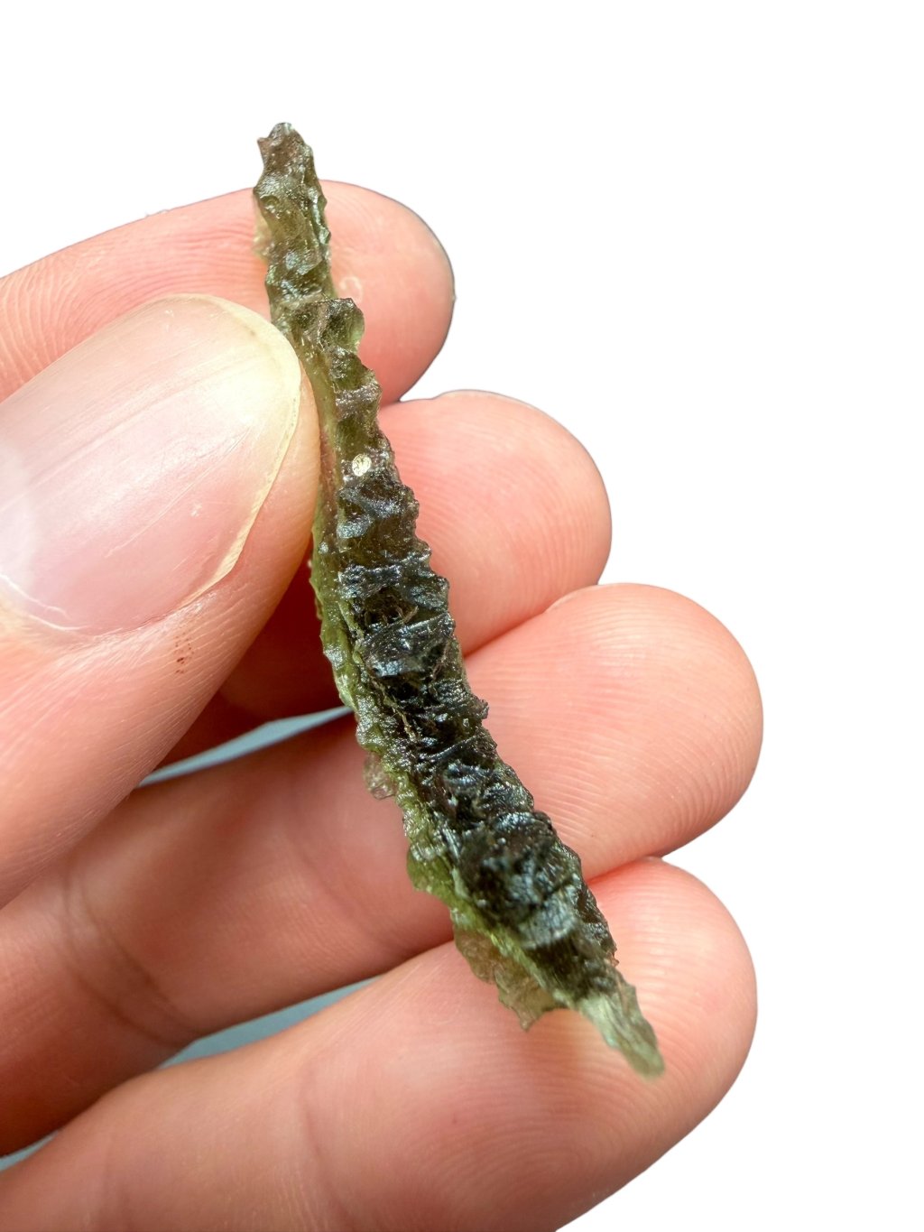 Dieser Moldavite stammt aus dem offiziellen Abbau in Besednice, bei dem es häufig zu Beschädigungen der Steine kam. Die beschädigten glänzenden Flächen wurden anschließend mit Säure mattiert. Solche reparierten Moldavite werden in eine niedrigere Qualitätsklasse eingestuft, was sich auch im Preis widerspiegelt, der im Vergleich zu unbeschädigten Moldaviten deutlich niedriger und erschwinglicher ist. Diese Moldavite eignen sich sowohl für Schmuck als auch für Sammler, die den niedrigeren Preis für sehr schöne Stücke mit der einzigartigen, tiefen Struktur der Moldavite aus der Besednice Jezkovna zu schätzen wissen.