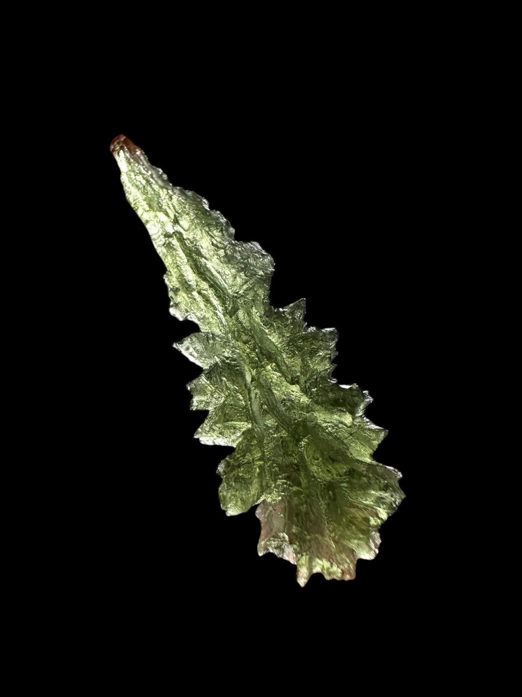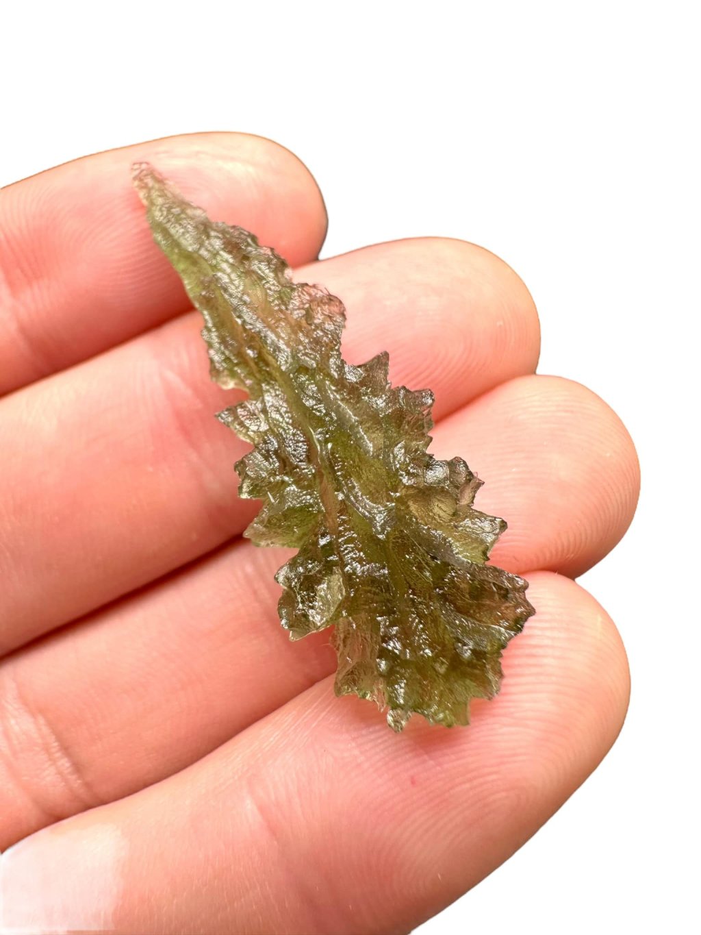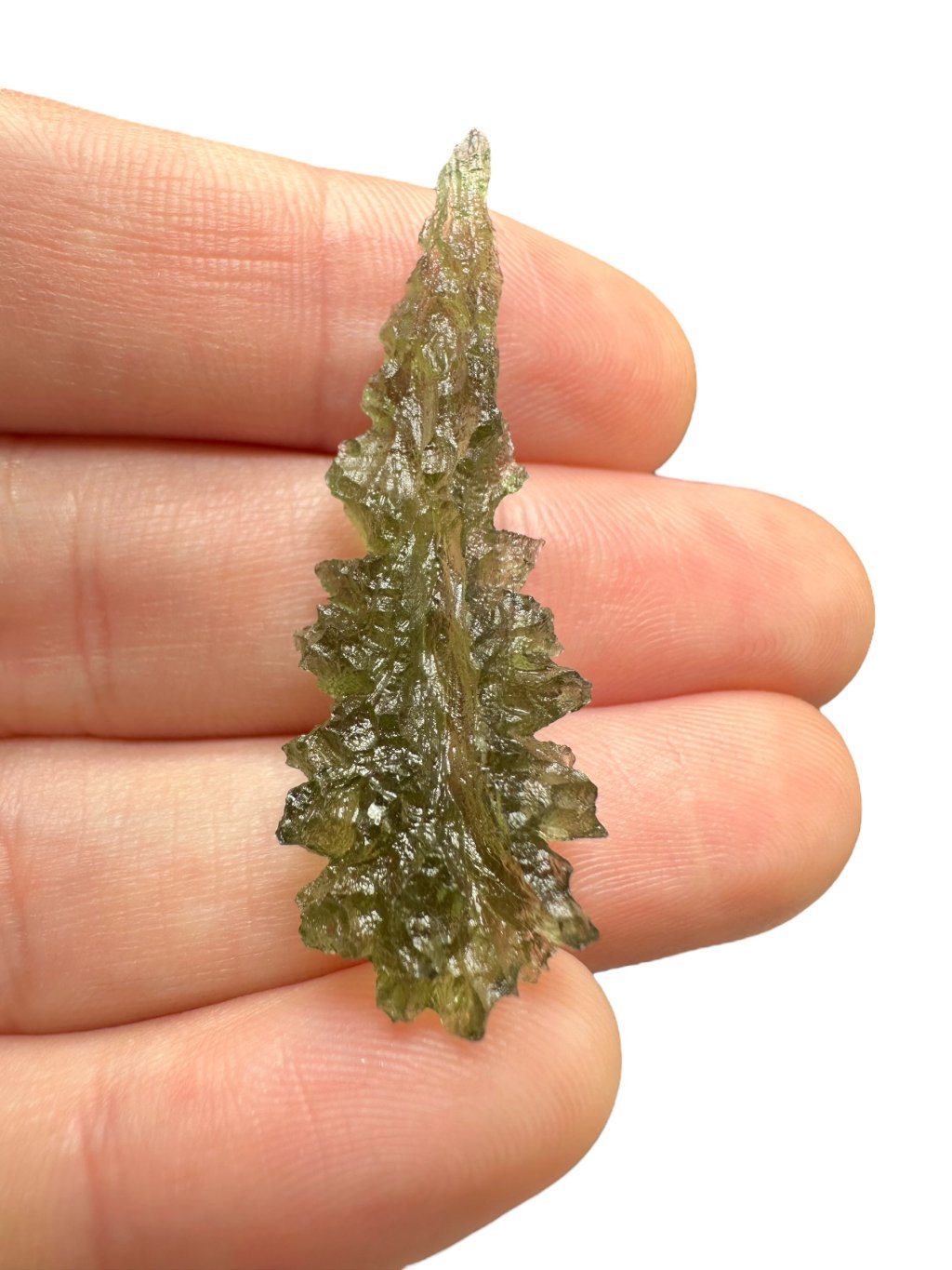 Dieser Moldavite stammt aus dem offiziellen Abbau in Besednice, bei dem es häufig zu Beschädigungen der Steine kam. Die beschädigten glänzenden Flächen wurden anschließend mit Säure mattiert. Solche reparierten Moldavite werden in eine niedrigere Qualitätsklasse eingestuft, was sich auch im Preis widerspiegelt, der im Vergleich zu unbeschädigten Moldaviten deutlich niedriger und erschwinglicher ist. Diese Moldavite eignen sich sowohl für Schmuck als auch für Sammler, die den niedrigeren Preis für sehr schöne Stücke mit der einzigartigen, tiefen Struktur der Moldavite aus der Besednice Jezkovna zu schätzen wissen.