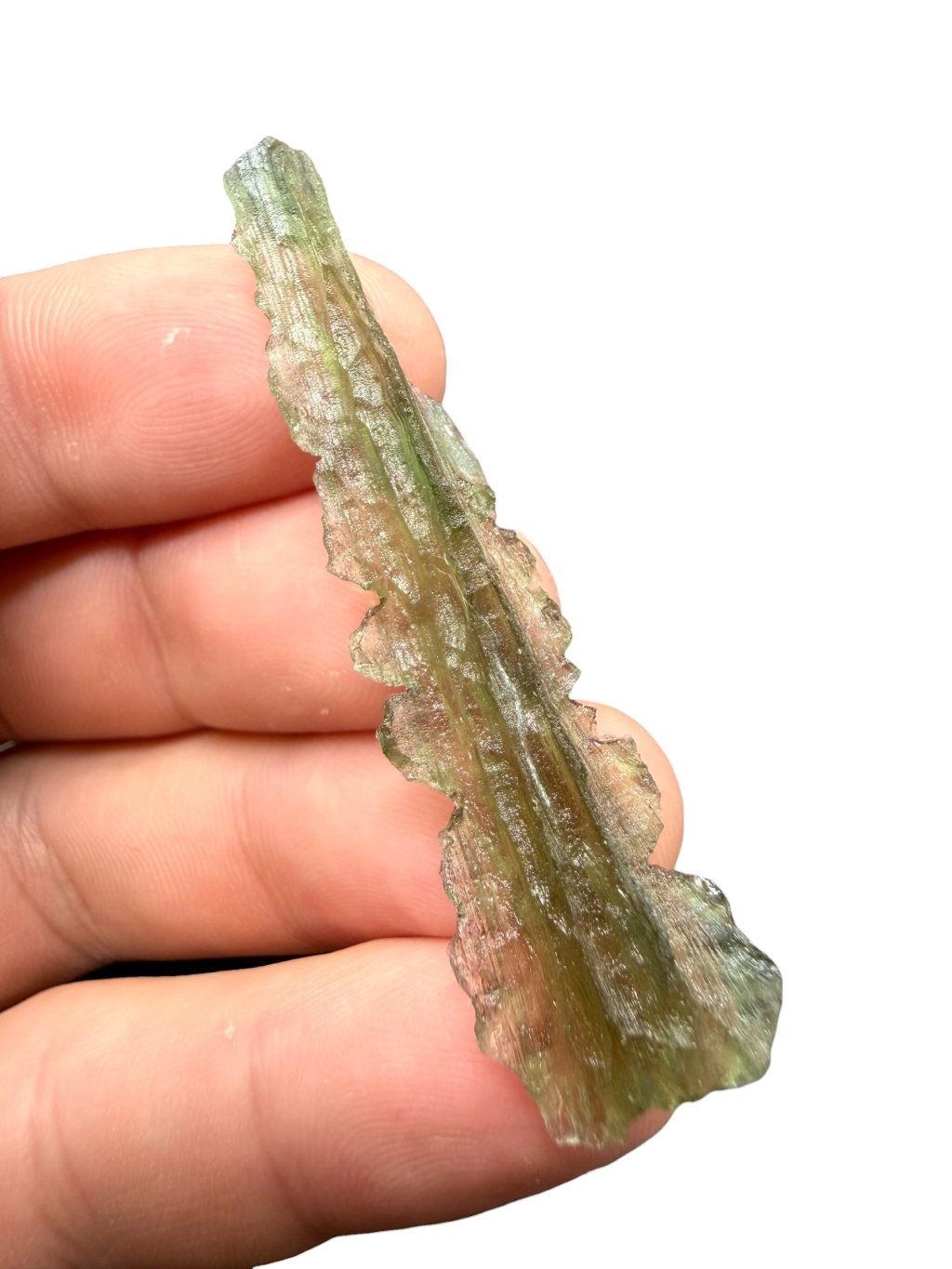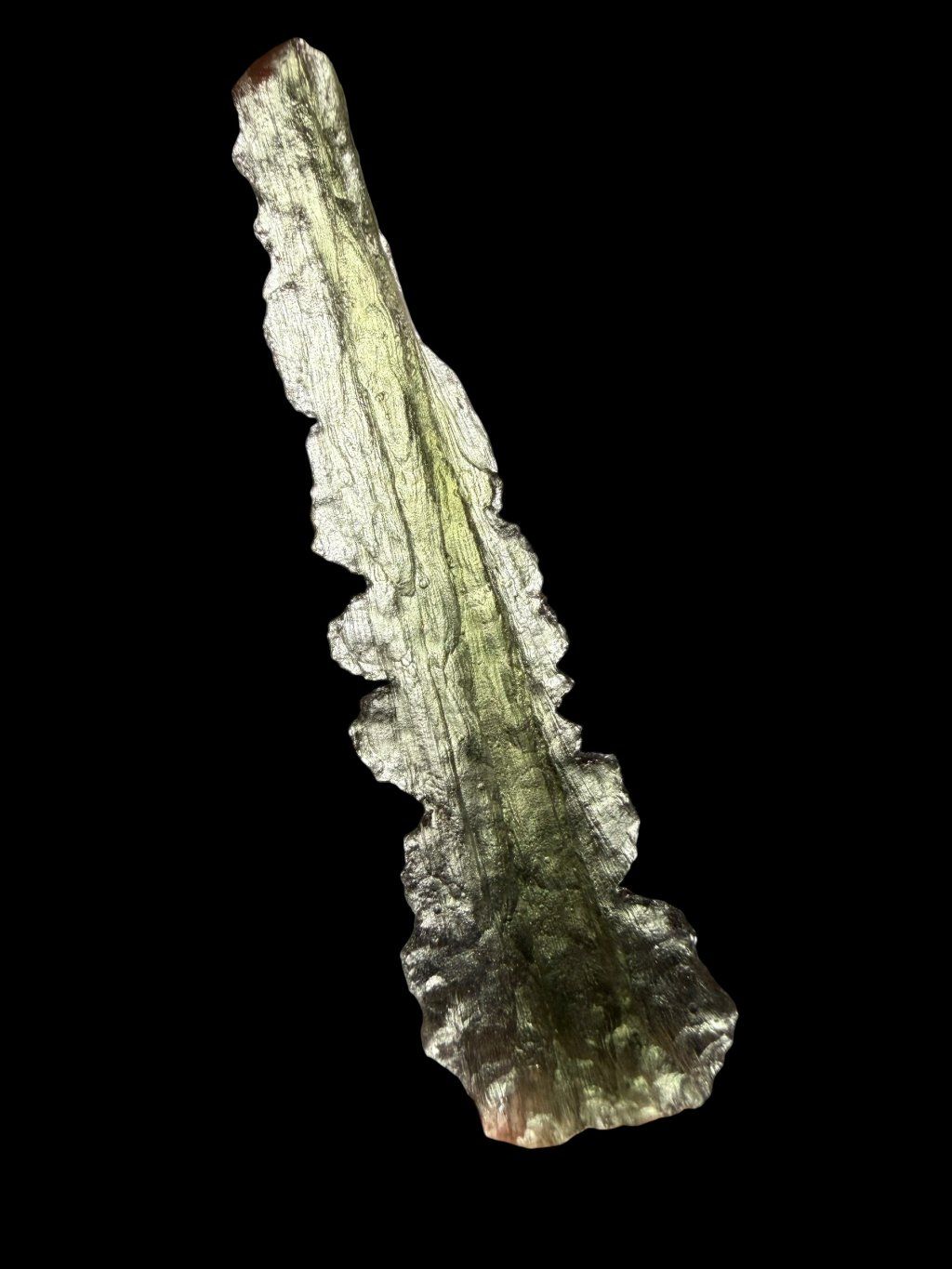 Dieser Moldavite stammt aus dem offiziellen Abbau in Besednice, bei dem es häufig zu Beschädigungen der Steine kam. Die beschädigten glänzenden Flächen wurden anschließend mit Säure mattiert. Solche reparierten Moldavite werden in eine niedrigere Qualitätsklasse eingestuft, was sich auch im Preis widerspiegelt, der im Vergleich zu unbeschädigten Moldaviten deutlich niedriger und erschwinglicher ist. Diese Moldavite eignen sich sowohl für Schmuck als auch für Sammler, die den niedrigeren Preis für sehr schöne Stücke mit der einzigartigen, tiefen Struktur der Moldavite aus der Besednice Jezkovna zu schätzen wissen.