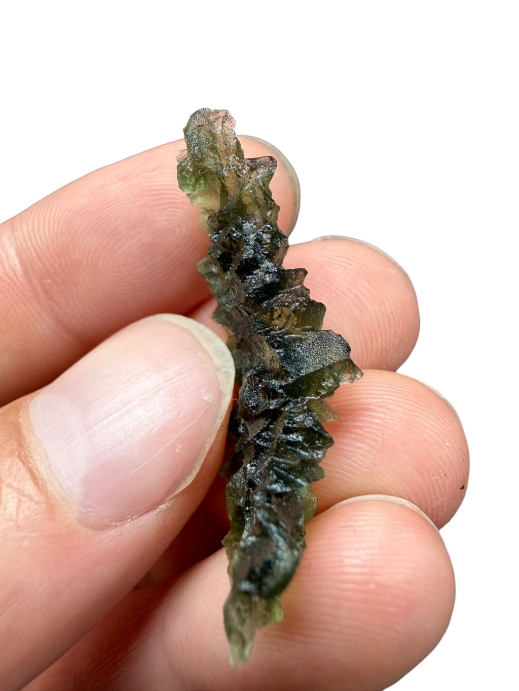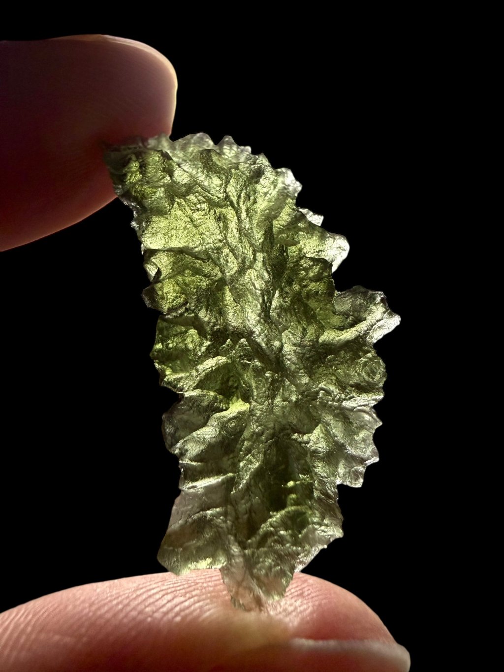Dieser Moldavite stammt aus dem offiziellen Abbau in Besednice, bei dem es häufig zu Beschädigungen der Steine kam. Die beschädigten glänzenden Flächen wurden anschließend mit Säure mattiert. Solche reparierten Moldavite werden in eine niedrigere Qualitätsklasse eingestuft, was sich auch im Preis widerspiegelt, der im Vergleich zu unbeschädigten Moldaviten deutlich niedriger und erschwinglicher ist. Diese Moldavite eignen sich sowohl für Schmuck als auch für Sammler, die den niedrigeren Preis für sehr schöne Stücke mit der einzigartigen, tiefen Struktur der Moldavite aus der Besednice Jezkovna zu schätzen wissen.